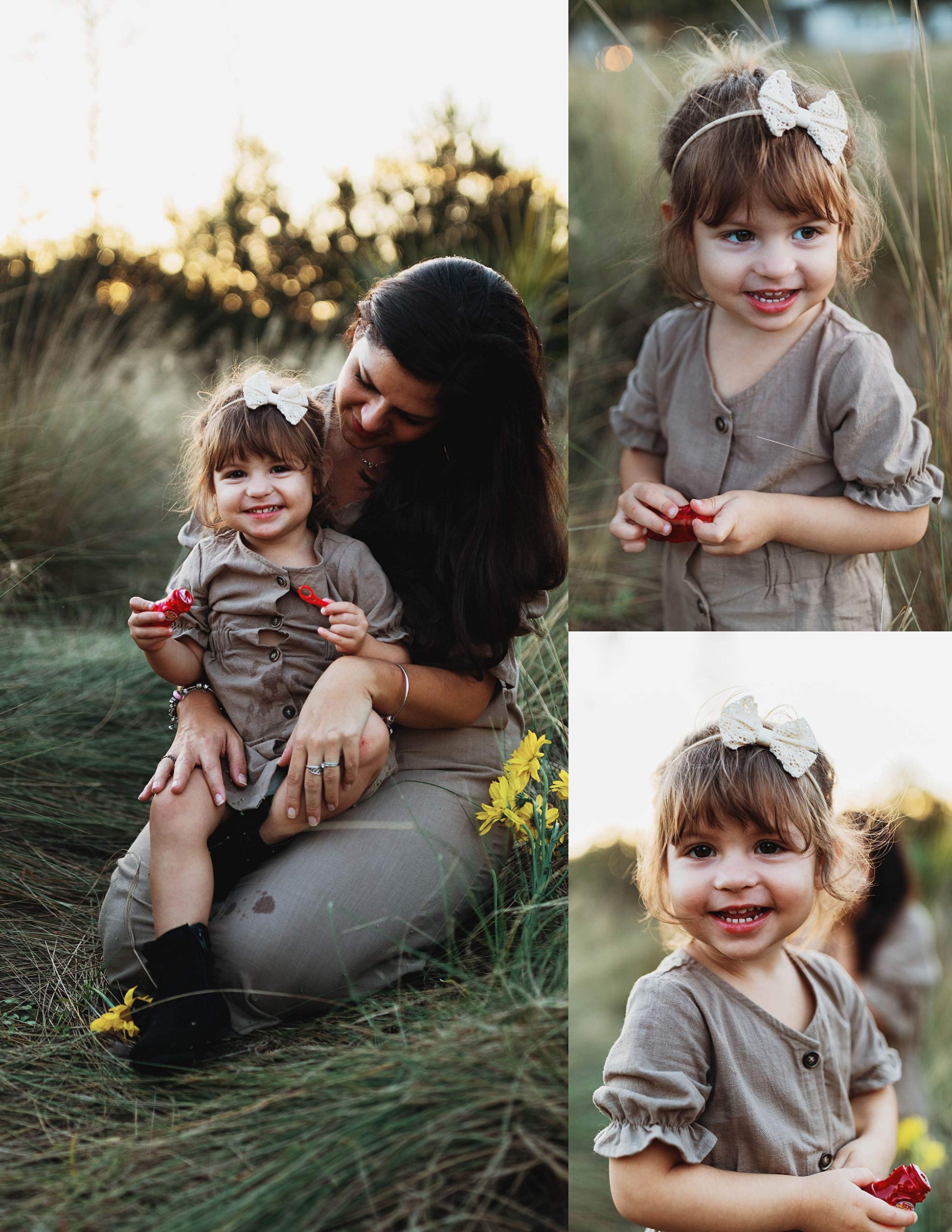 - Q: How many headbands come in a set? A: The California Tot headband set includes four premium bows on nylon headbands in a golden neutral color palette.