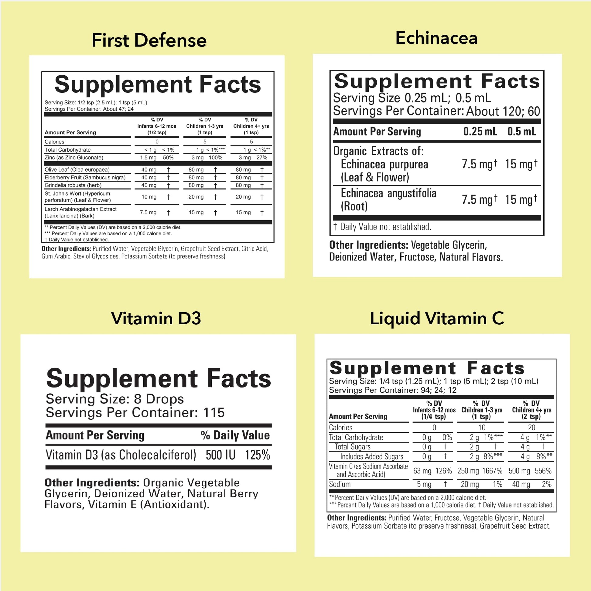 - Q: What are the key ingredients in the ChildLife Essentials Immune Support 4-Pack? A: The ChildLife Essentials Immune Support 4-Pack includes Organic Vitamin D3, Liquid Vitamin C, First Defense, and Echinacea.