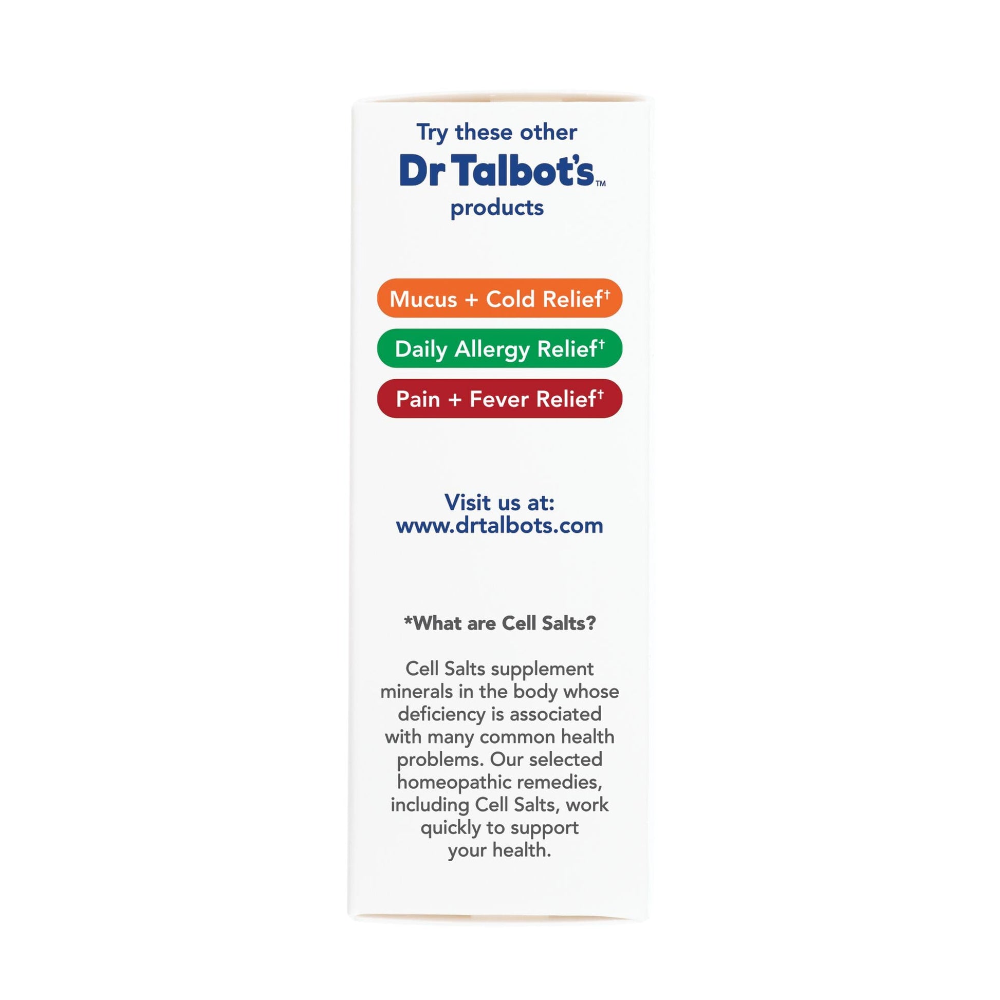 - Q: What flavors does Dr. Talbot's cough relief come in? A: Dr. Talbot's Infant Cough Relief comes in an elderberry juice flavor, which is designed to be baby-friendly and pleasant for infants.