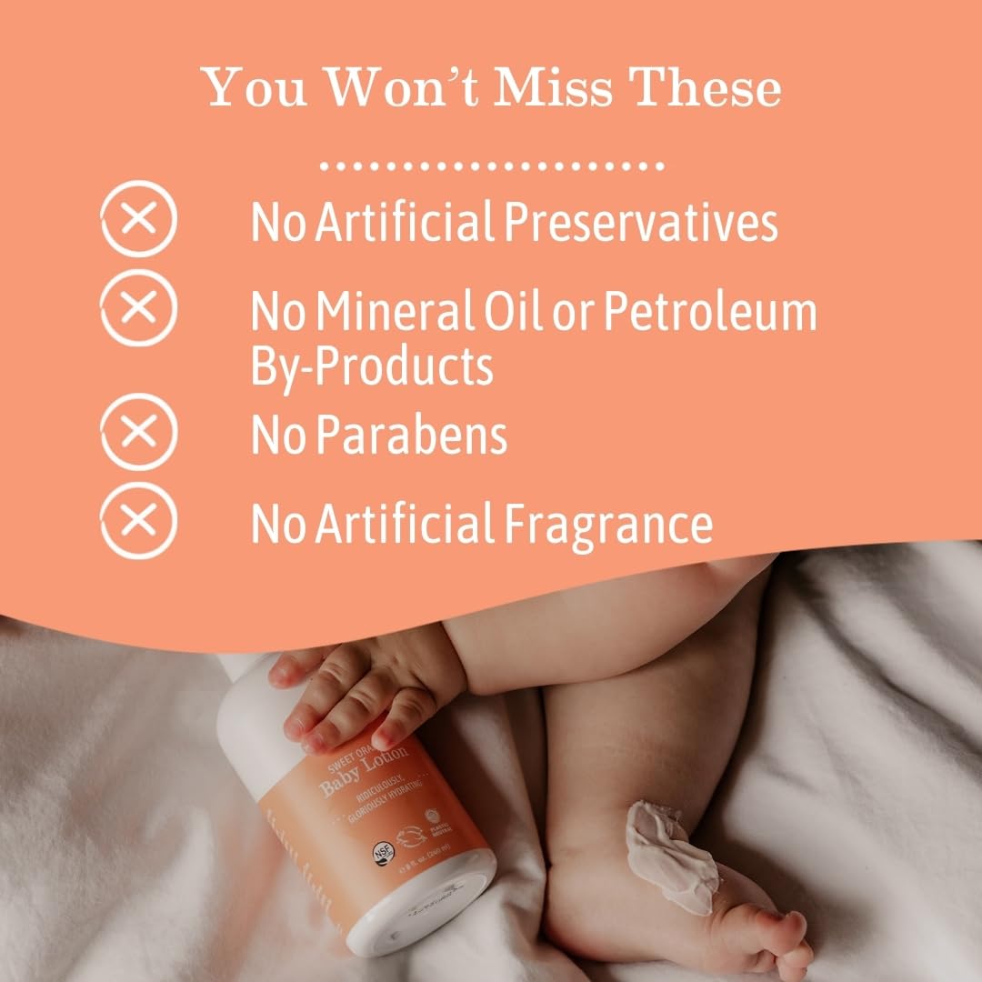 - Q: Is this baby lotion safe for sensitive skin? A: Yes, this lotion is formulated without petroleum, mineral oil, artificial fragrance, or preservatives, ensuring it is safe for sensitive skin.