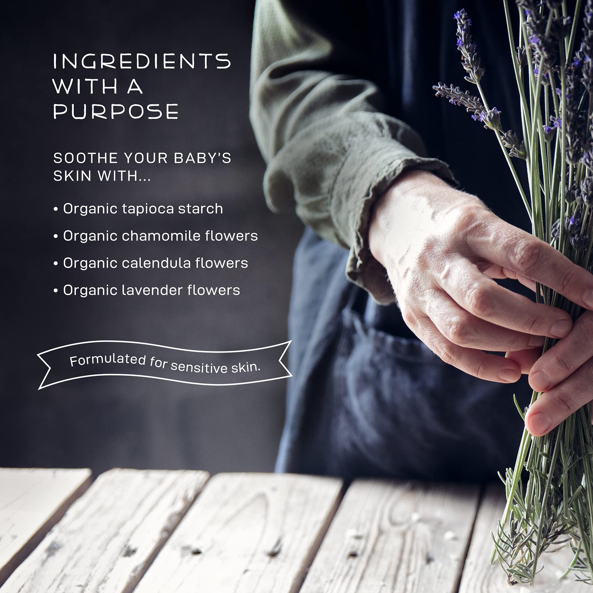 - Q: What are the main ingredients in this baby powder? A: The key ingredients include tapioca starch, chamomile flowers, calendula flowers, and lavender flowers, all of which are soothing and gentle for sensitive skin.