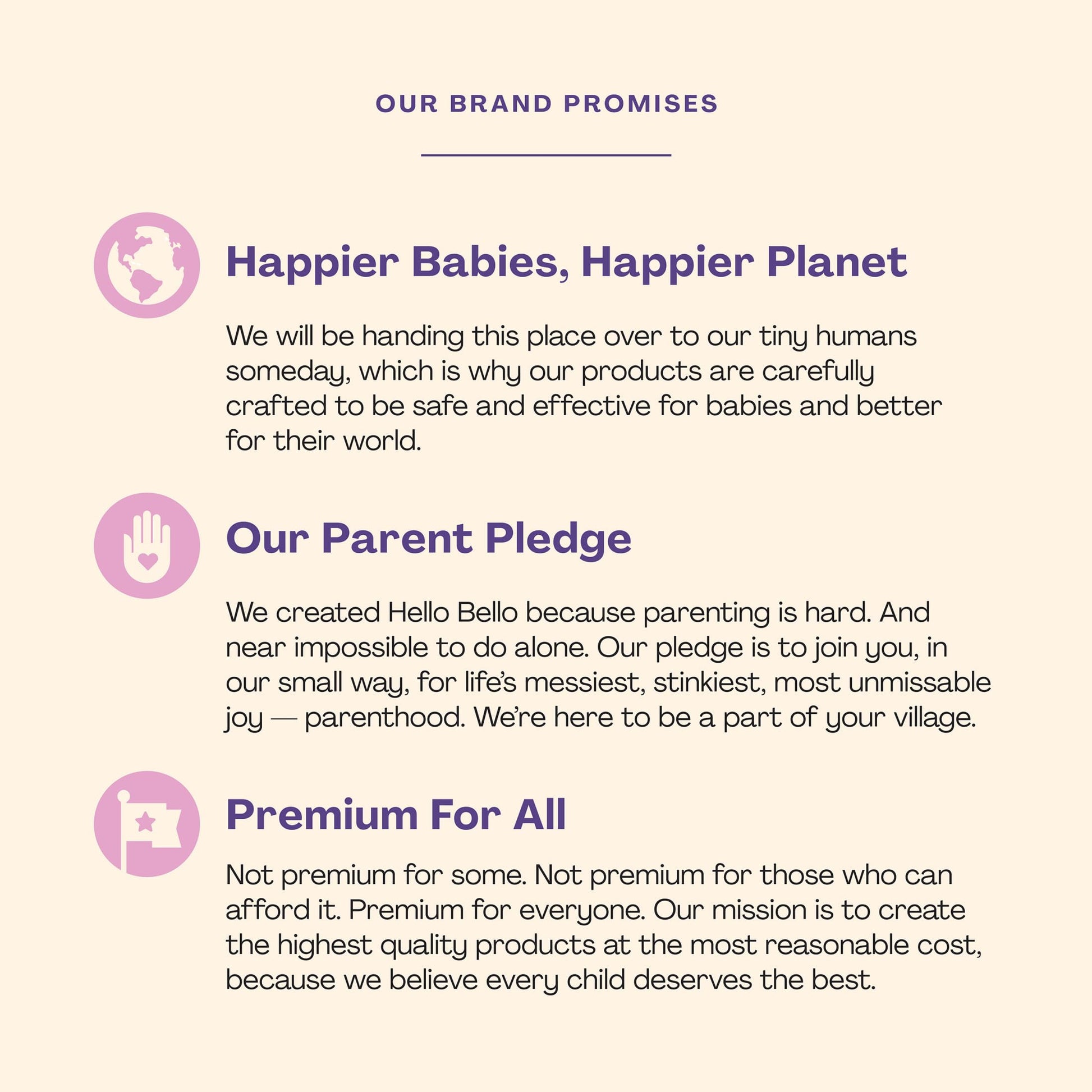 At hello bello, we have one simple goal: to eliminate the choice many parents have to make - deciding between whats best for their kids and best for their budget. We believe in premium for all because every baby deserves the best.