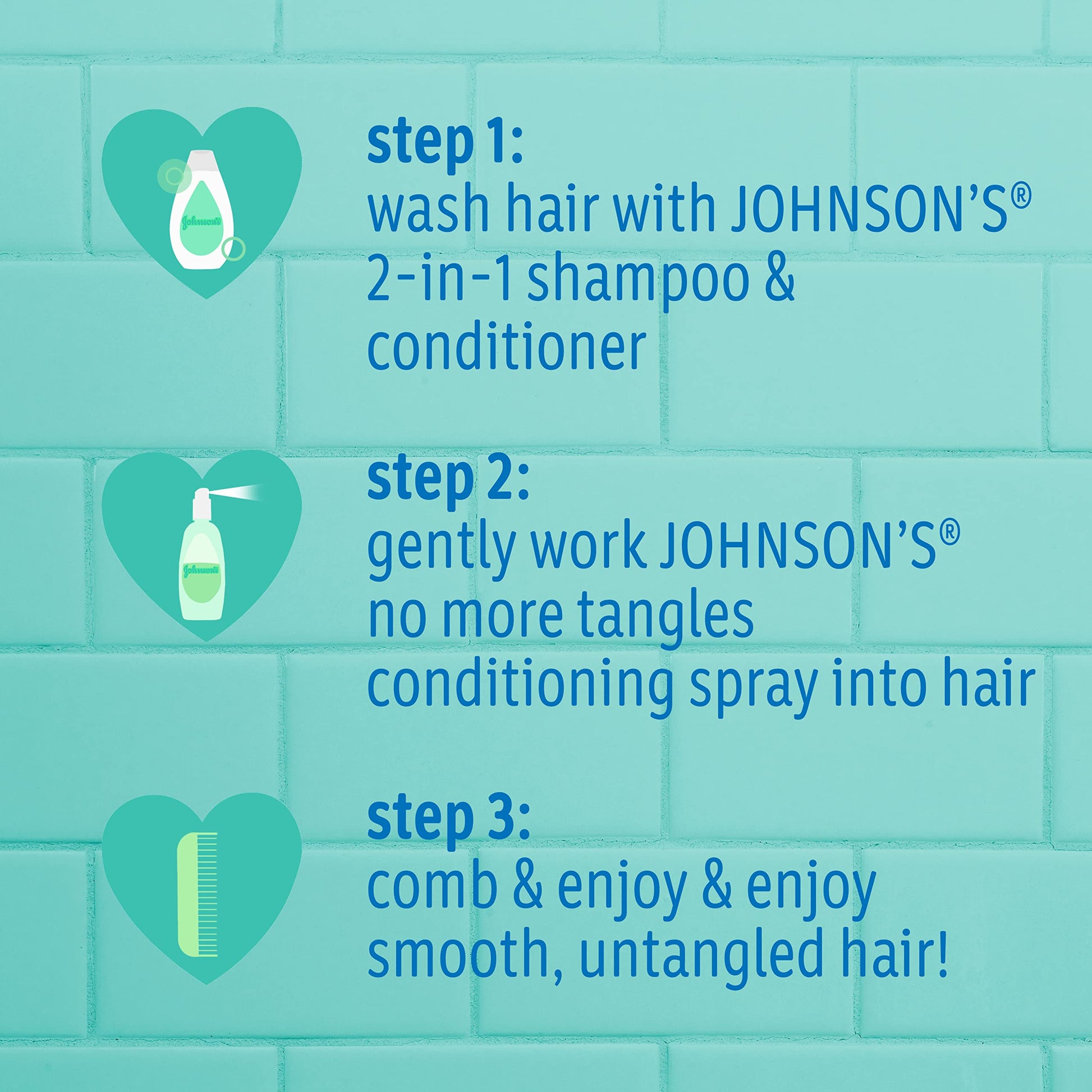 Tame tangles and snarls while making hair more manageable with Johnson's Buddies No More Tangles Detangler. Designed for use on wet or dry hair, this spray works on contact to loosen knots, so combing is easier. The gentle Johnson's No More Tears formula won't irritate eyes and requires no rinsing.