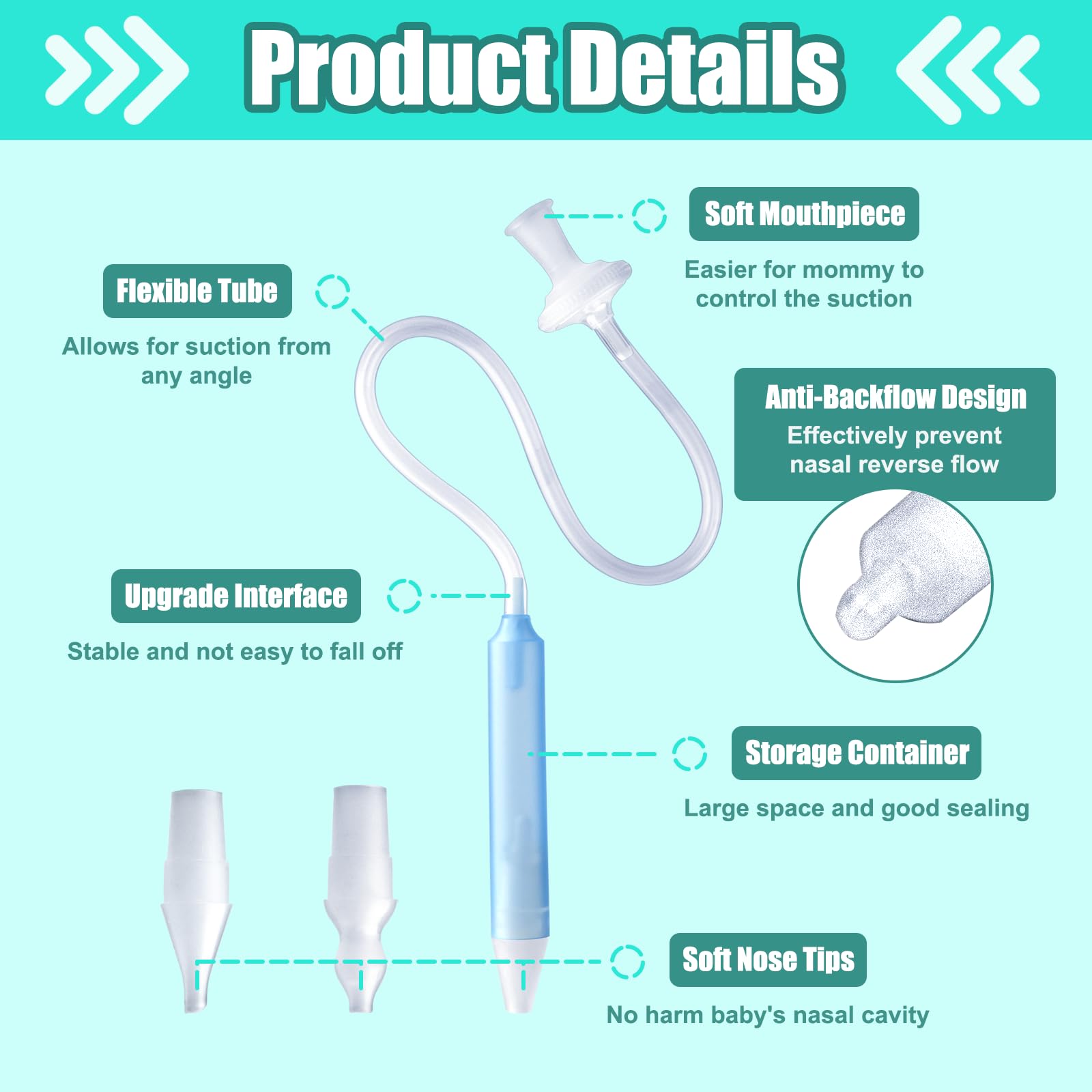 - Q: How does the nasal aspirator work? A: To use the nasal aspirator, connect the soft silicone nasal tip to the tube, gently place it in your baby's nostril, and use the mouthpiece to create suction, transferring mucus into the storage container.