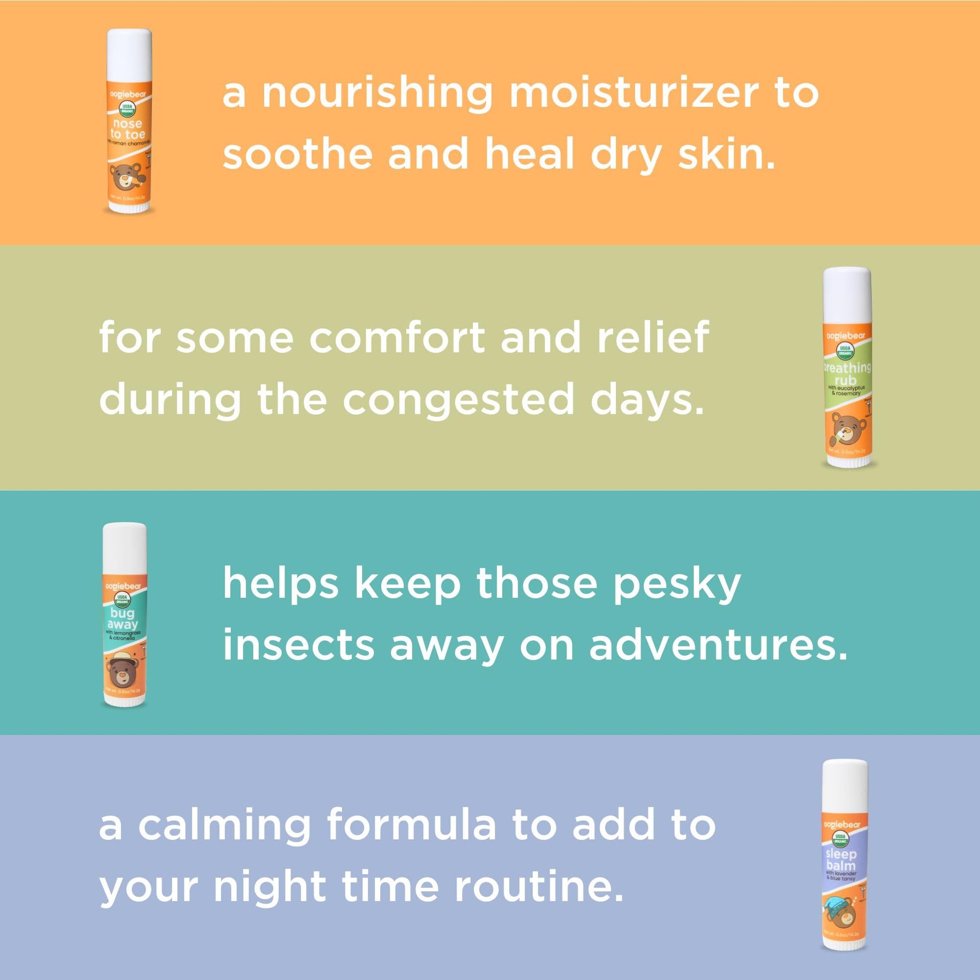 - Q: What does the 4-pack of balms include? A: The 4-pack includes a Nose-to-Toe Balm for hydration, a Breathing Rub for soothing stuffy noses, a Bug Away Balm for outdoor protection, and a Sleep Balm to promote relaxation.