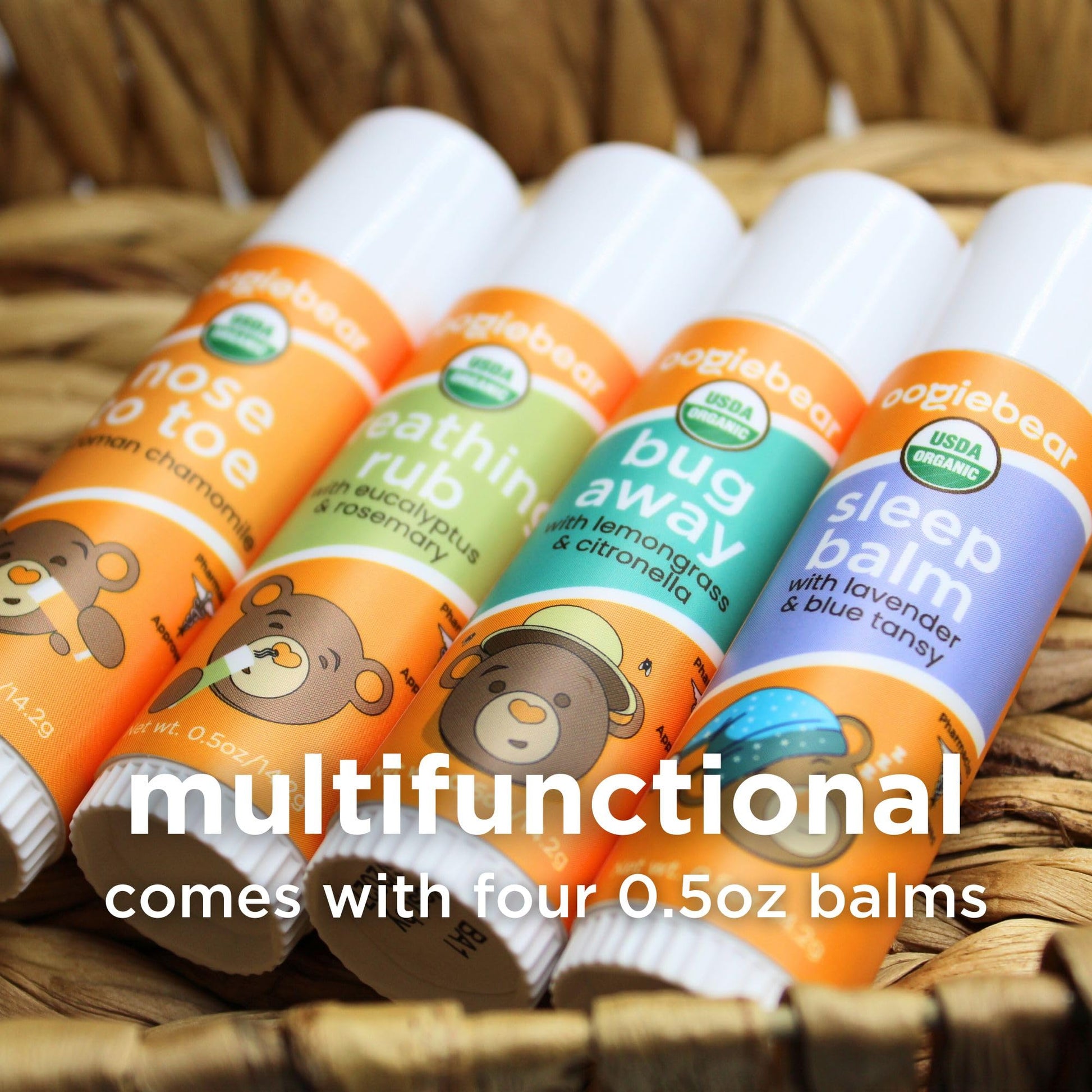 - Q: What are the main benefits of using oogiebear Organic Baby Balm? A: The oogiebear Organic Baby Balm provides gentle relief from dry skin and stuffy noses, helping babies and toddlers sleep, play, and breathe better with its all-natural, USDA-certified organic formulations.