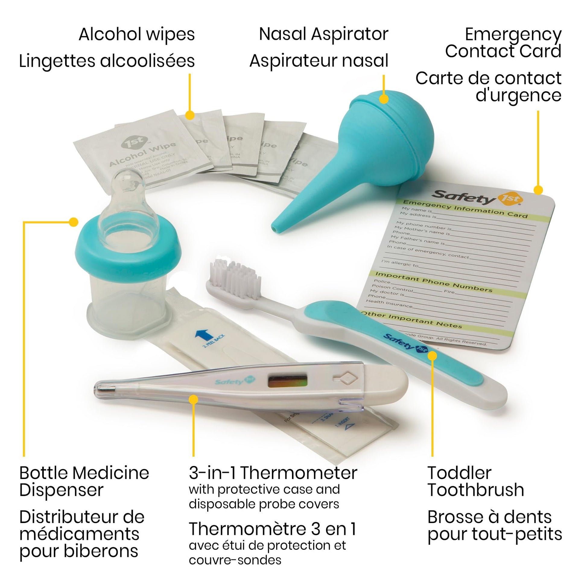 The Safety 1st Deluxe Healthcare & Grooming Kit 1st gives parents a convenient all-in-one baby essentials kit that is great to have when on the go. This deluxe assortment includes a 3-in-1 digital thermometer that can measure temperatures in Fahrenheit and Celsius and comes with a protective case; a toddler toothbrush with a chunky, easy-to-hold handle; a bottle medicine dispenser that lets you give baby medicine in a comforting, familiar way; and much more. The wrapping clutch case with zippered, clear-view compartments helps you easily keep things where you can see them and get to them quickly. Toss the case into your diaper bag and it'll be there when you need it.