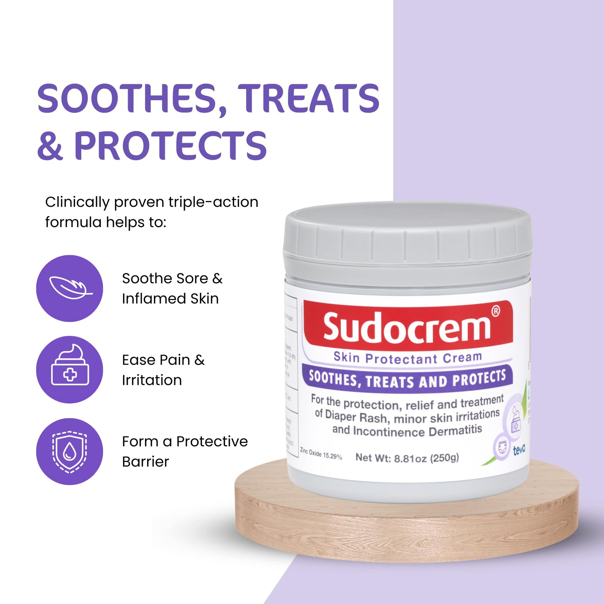 • Q: How does the triple action formula work? A: The triple action formula of Sudocrem helps to soothe inflamed skin, treat existing rash and irritations, and protect the skin by forming a barrier against wetness.