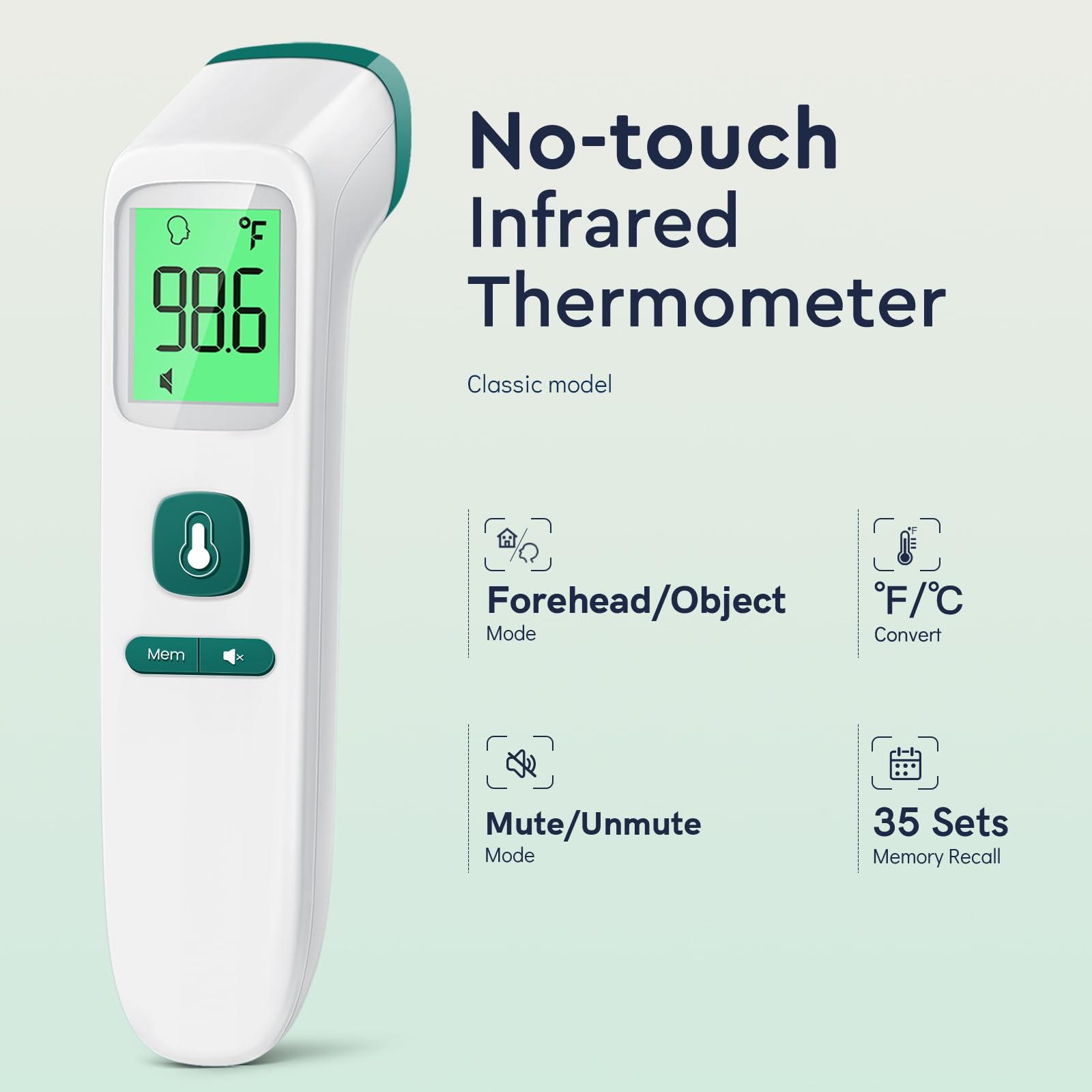 - Q: What additional features does this thermometer offer? A: The Viproud Forehead Thermometer includes features such as 35 memory recalls for tracking temperature changes, automatic shut-off for battery saving, and a guidance light for accurate aiming.