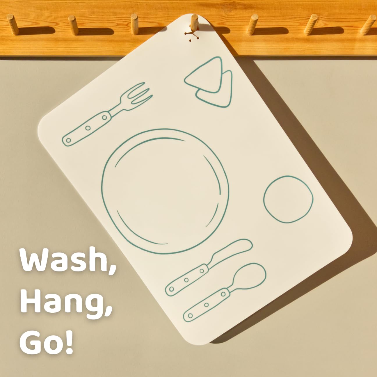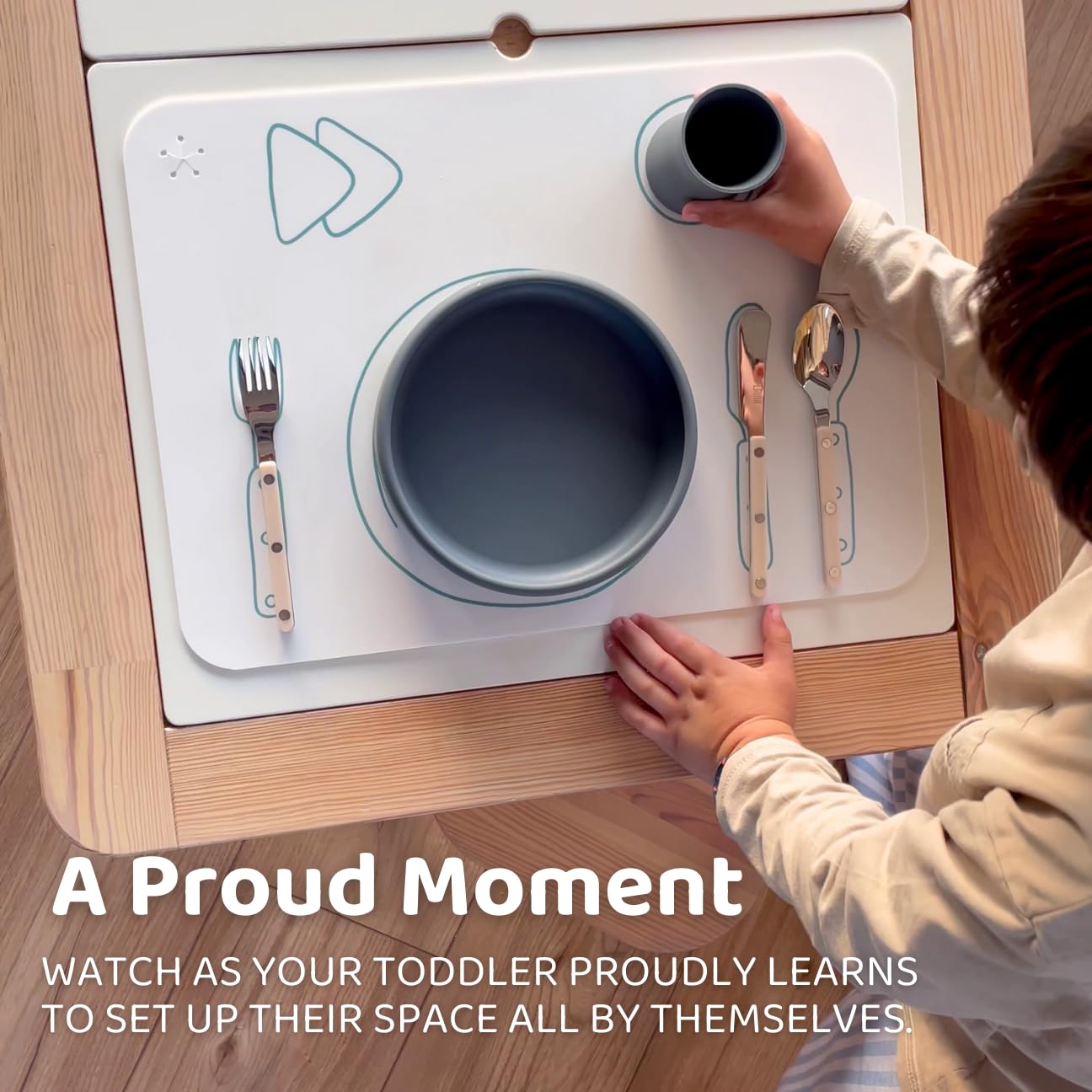 - Q: How does this placemat promote independence in toddlers? A: The placemat includes Montessori-inspired graphics that guide children in setting the table, helping them learn essential self-feeding and life skills.