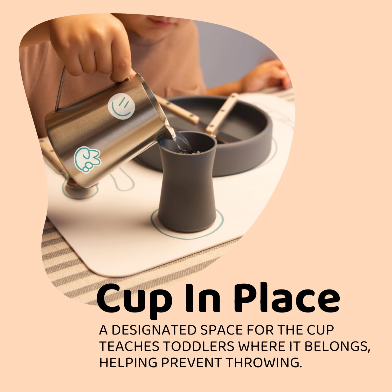- Q: What features help make mealtime more comfortable for kids? A: The placemat has clearly illustrated placement areas for utensils and cups, reducing the chance of thrown items and creating a peaceful dining experience.