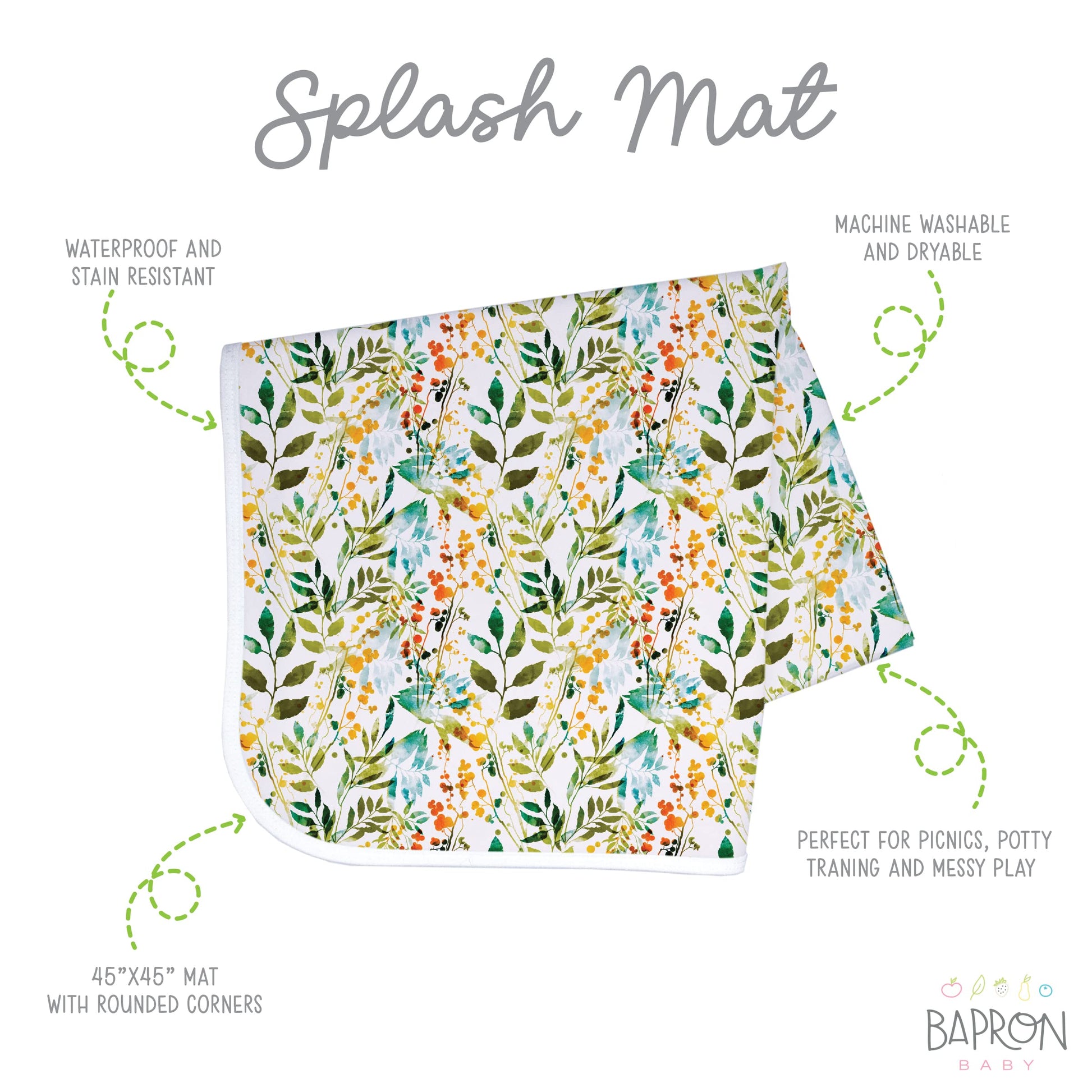 • Q: What are the dimensions of the BapronBaby Autumn Leaves Splash Mat? A: The BapronBaby Autumn Leaves Splash Mat measures 45 inches by 45 inches.