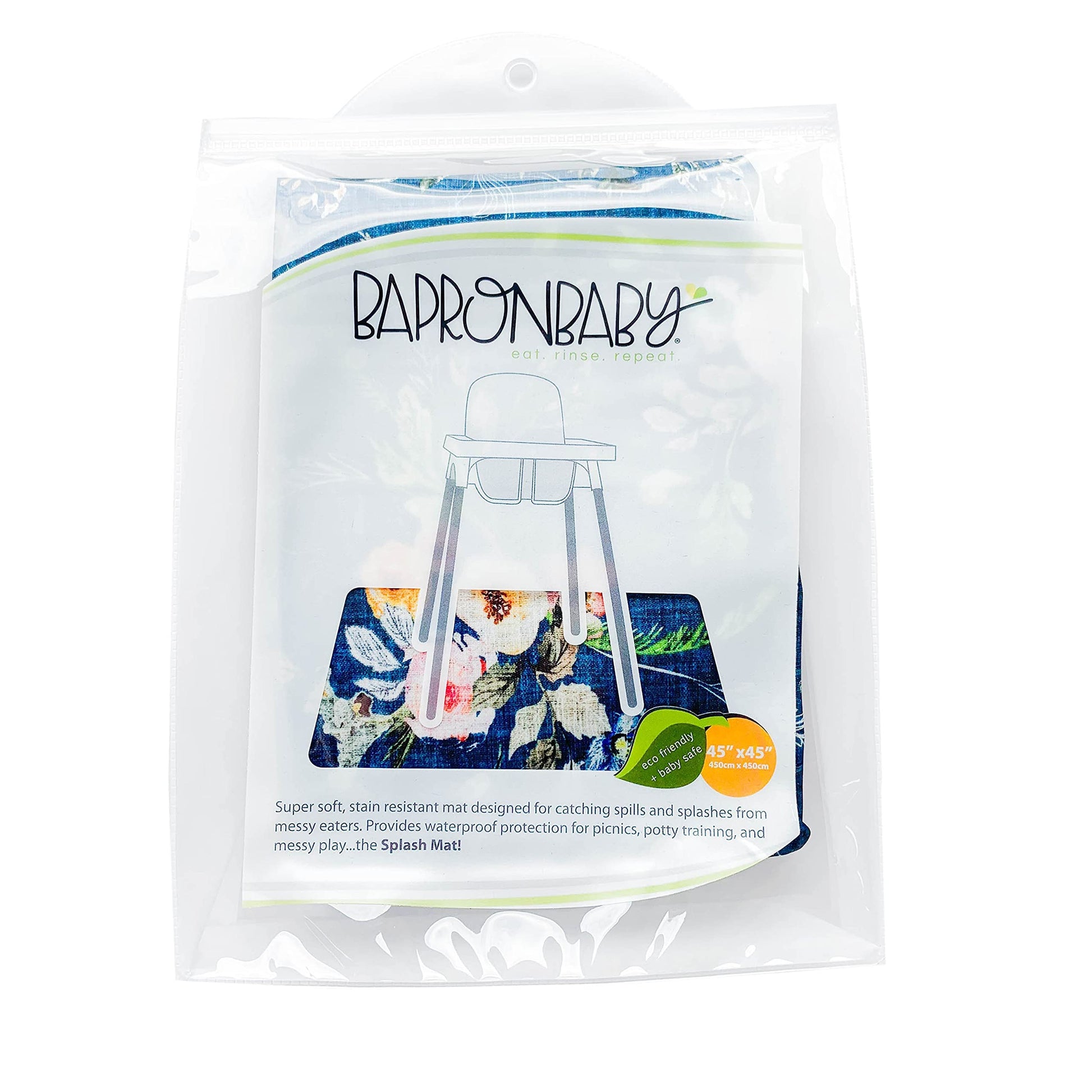 - Q: What size is the BapronBaby Boho Floral Splash Mat? A: The BapronBaby Boho Floral Splash Mat measures 45 inches in diameter.