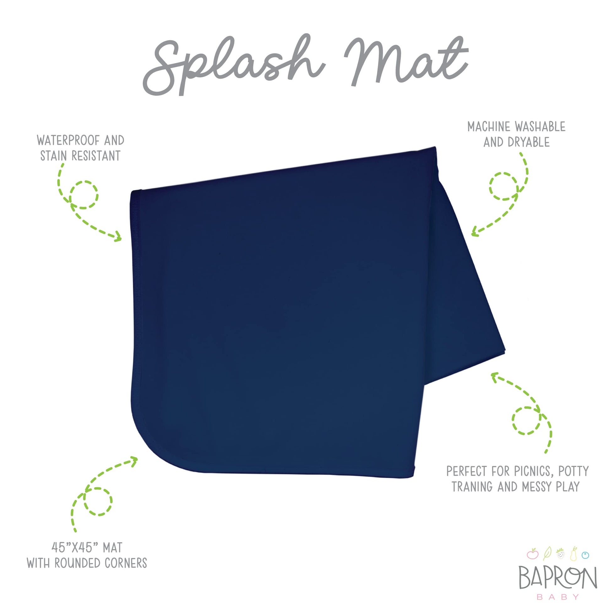 • Q: What are the dimensions of the BapronBaby Minimalist Navy Splash Mat? A: The BapronBaby Minimalist Navy Splash Mat measures 45 inches by 45 inches.