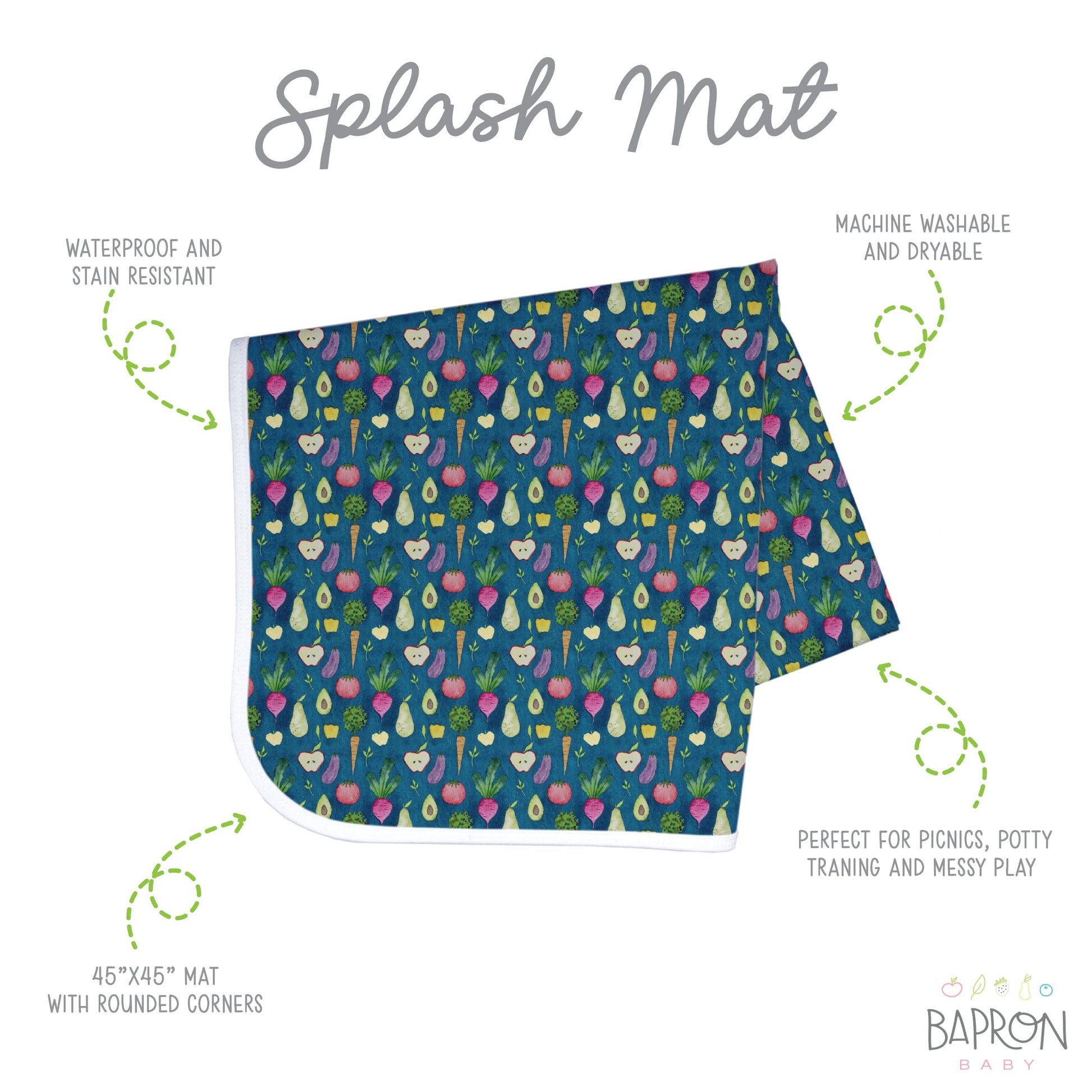 - Q: What are the dimensions of the BapronBaby Organic Produce Splash Mat? A: The BapronBaby Organic Produce Splash Mat measures 45 inches in diameter.