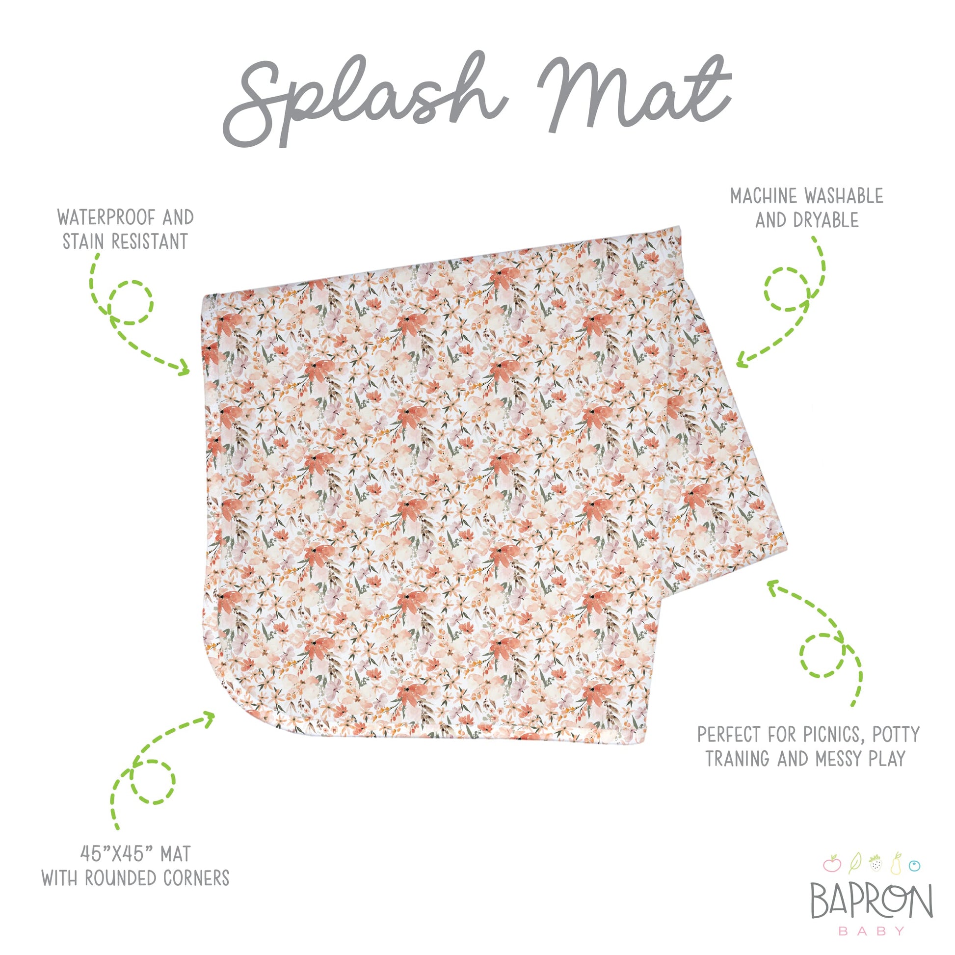 - Q: What are some uses for the BapronBaby splash mat? A: The splash mat can be used under high chairs, for potty training, as a waterproof nap pad, or for arts and crafts.