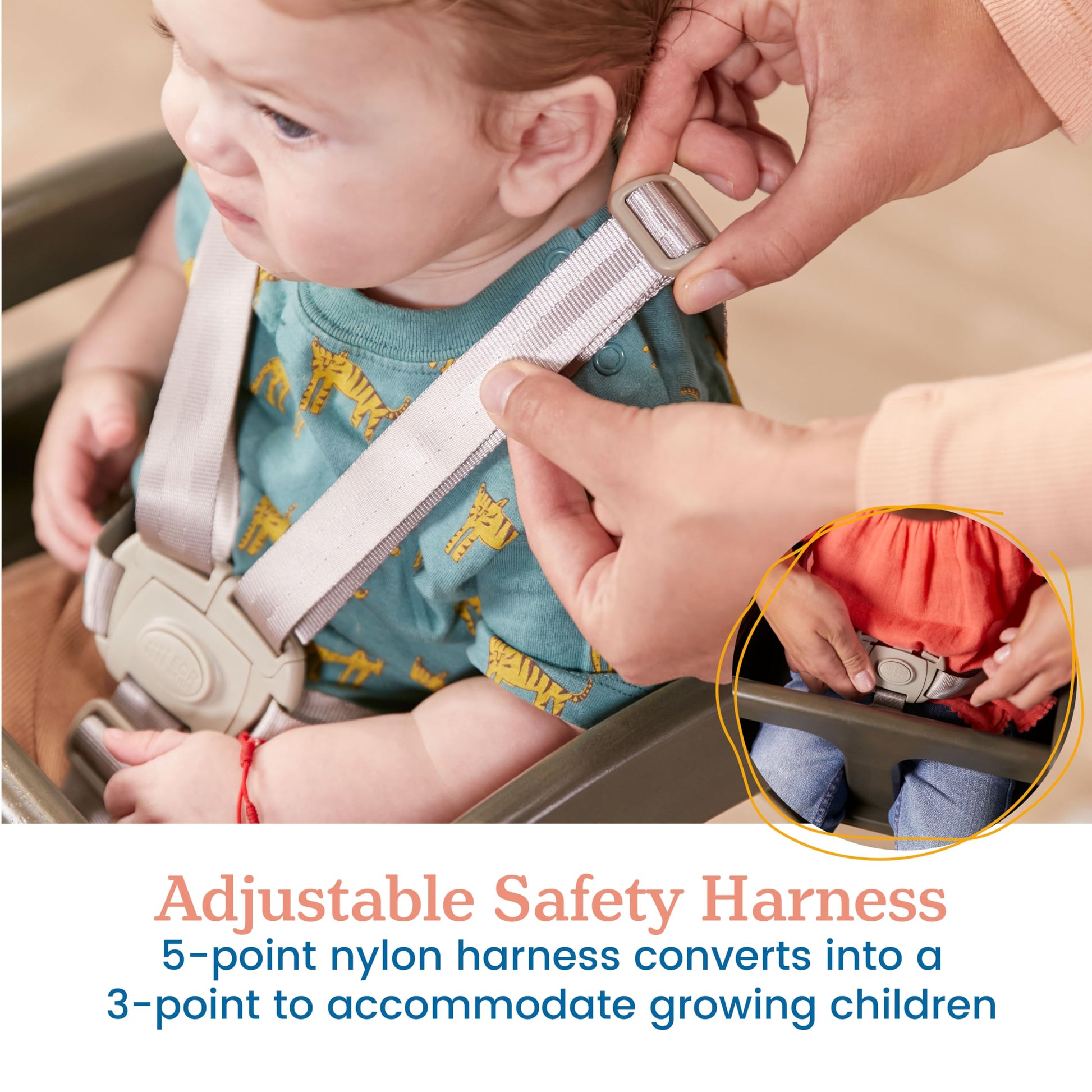 - Q: How does the safety harness work on this high chair? A: The high chair includes a unique 5-point safety harness to securely hold your child in place, which can be easily converted to a 3-point harness as your child matures.