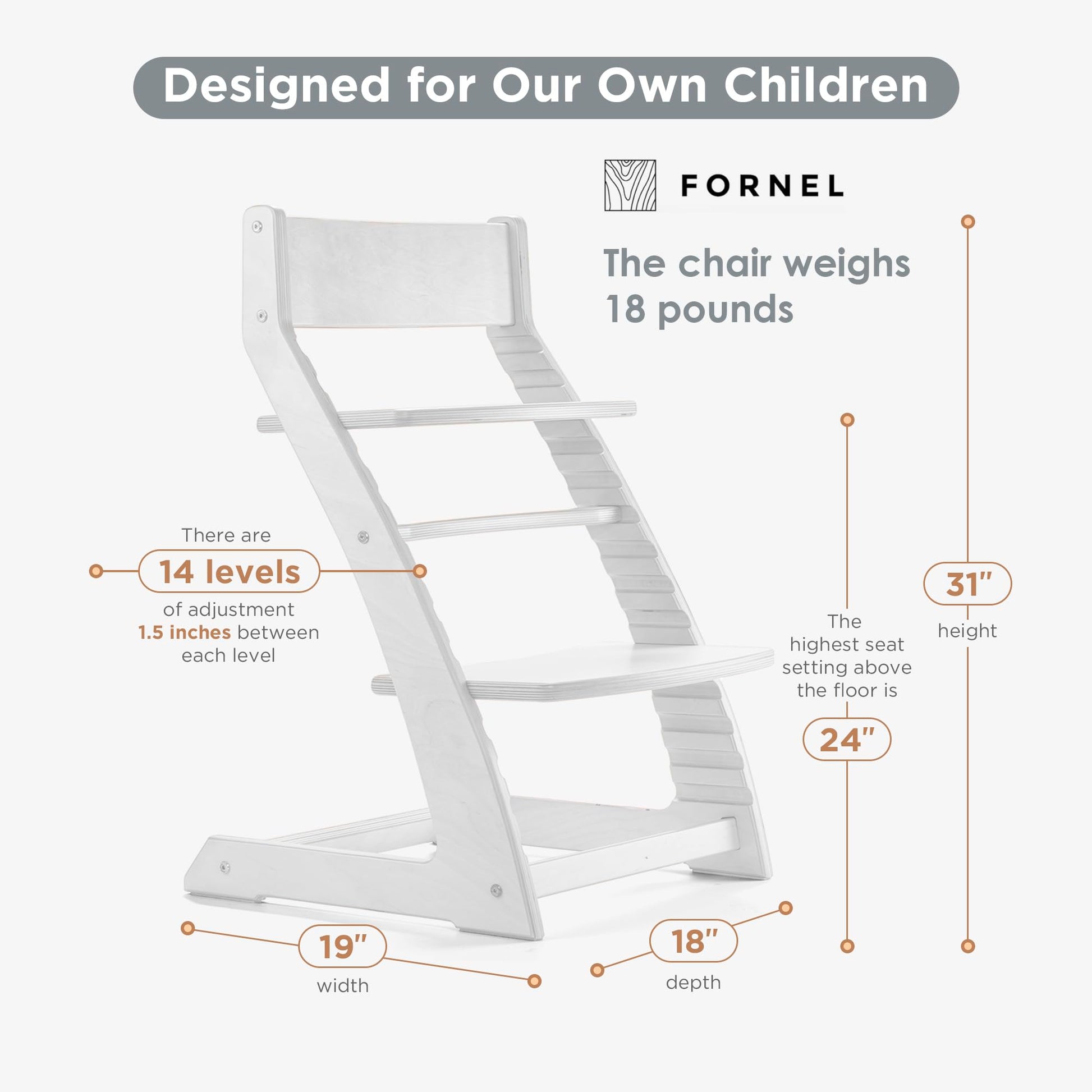 - Q: What are the dimensions of the Fornel Highchair? A: The dimensions of the Fornel Highchair are 19 inches in width, 18 inches in depth, and 31 inches in height.