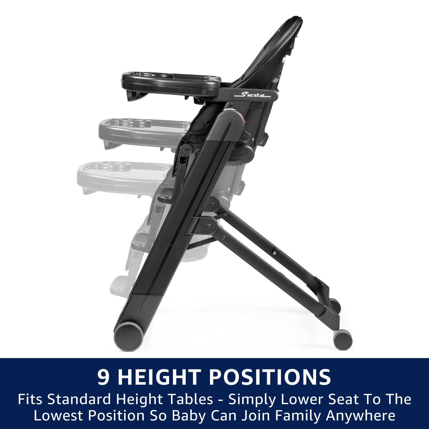 - Q: What are the height adjustments available for the Siesta high chair? A: The Siesta high chair has nine height positions, allowing it to adapt to different table heights for both infants and toddlers.