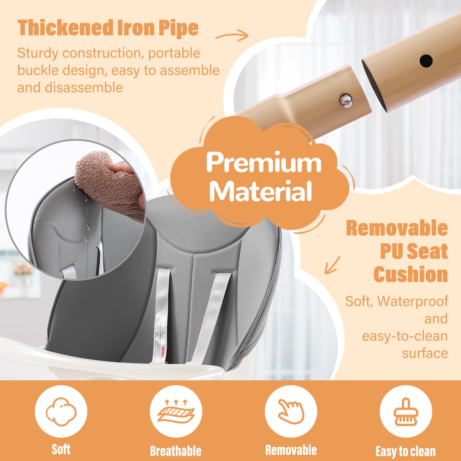 - Q: Is the high chair easy to clean? A: Yes, the high chair features a waterproof PU seat cushion that is easy to wipe clean. The removable tray is dishwasher safe for convenient cleanup.