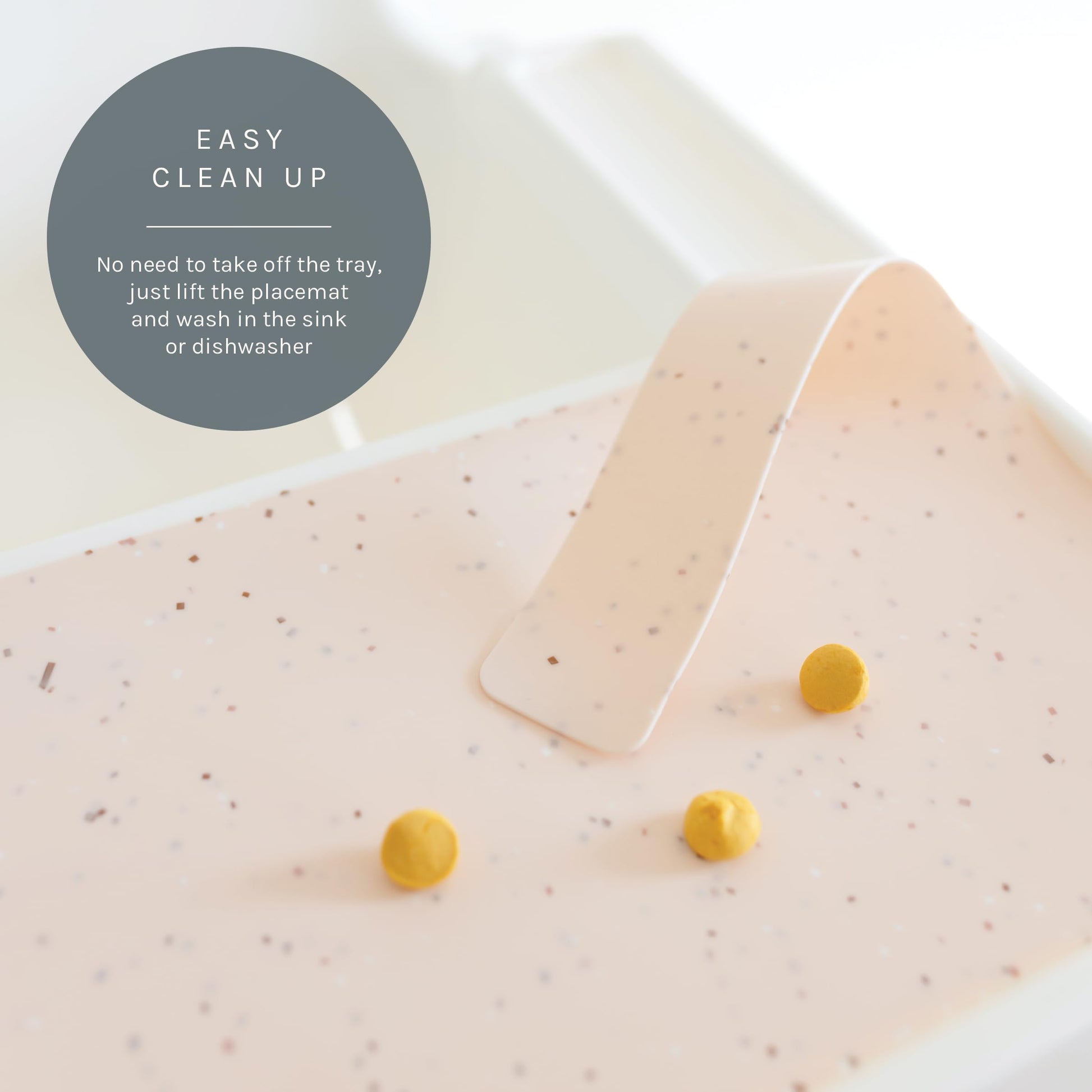 - Q: How do I clean the placemat? A: Cleaning the placemat is easy; simply lift it off the tray after mealtime and rinse it in the sink or place it in the dishwasher for a thorough clean.