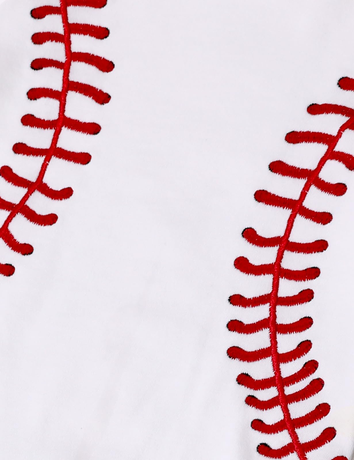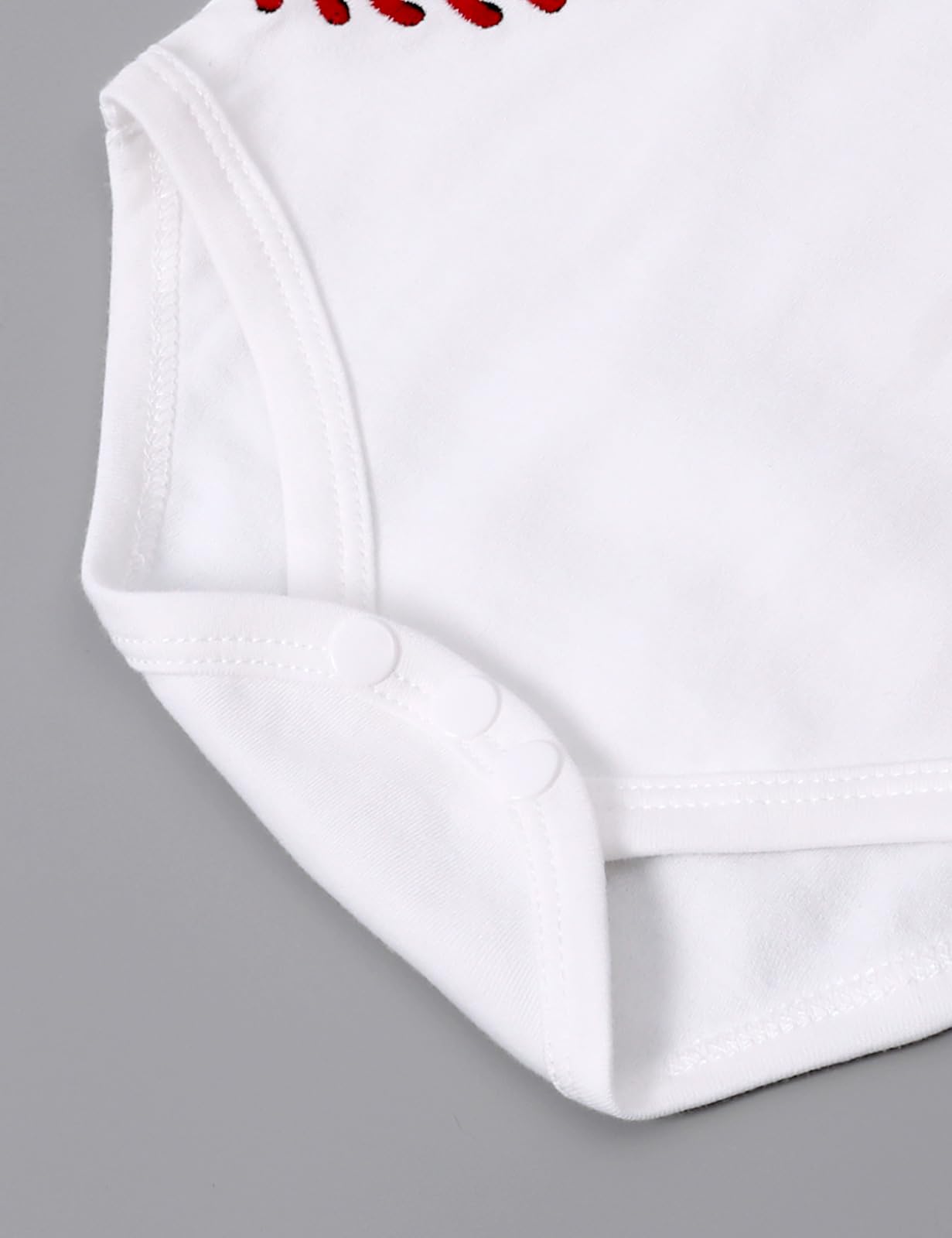 - Q: What design features does the outfit have? A: The outfit features a cute embroidered baseball pattern, an expandable lap-shoulder neckline for easy wear, and double-needle cuffs for added durability.