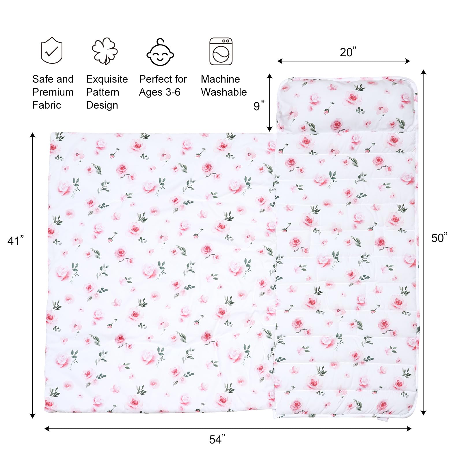 - Q: What are the dimensions of the Toddler Nap Mat Set? A: The Toddler Nap Mat Set measures 50 inches in length and 20 inches in width, while the attached comforter measures 41 inches by 34 inches.