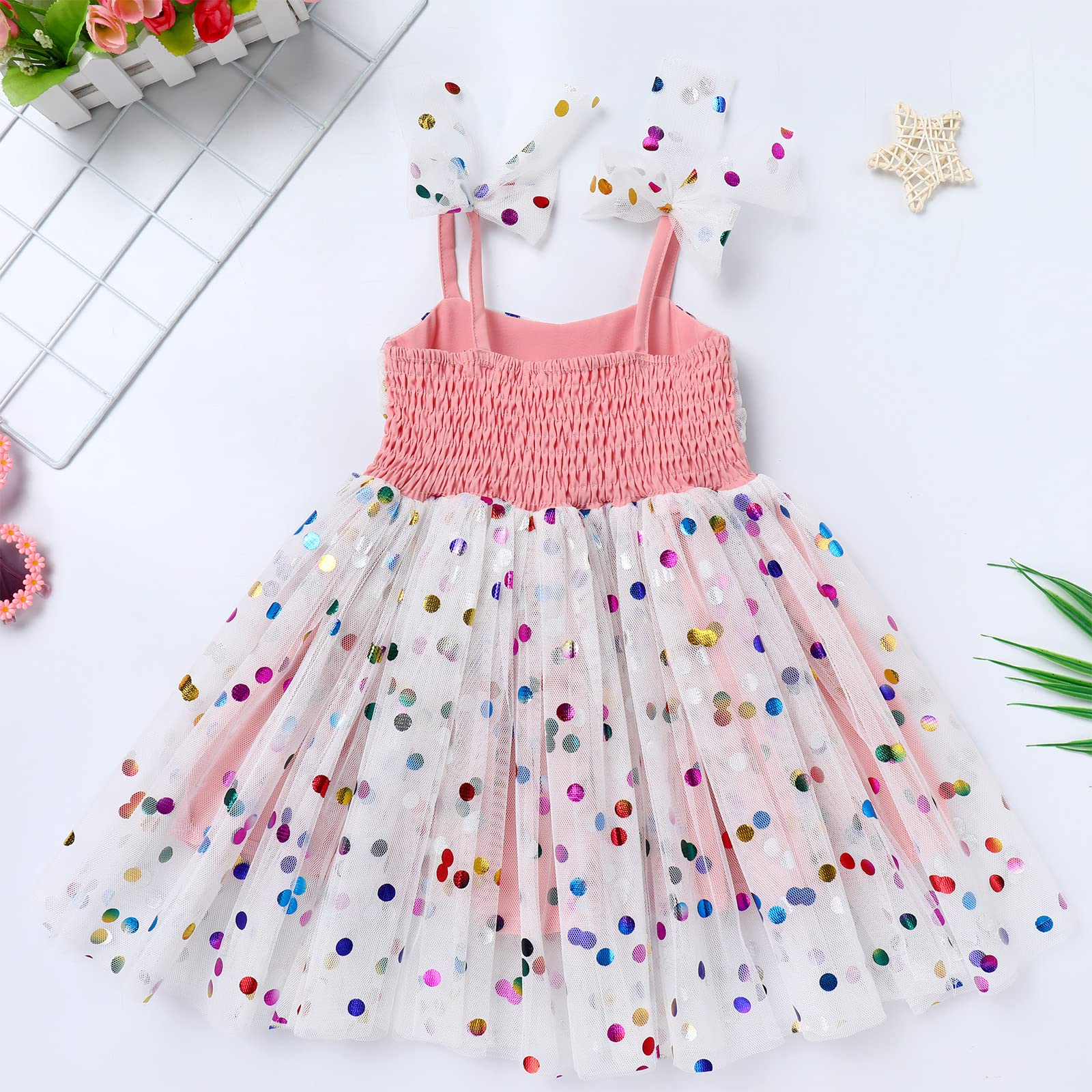 - Q: What colors are available for this outfit? A: The dress features vibrant colors, primarily pink and white, adorned with colorful rainbow sequins, providing a cheerful and festive look.