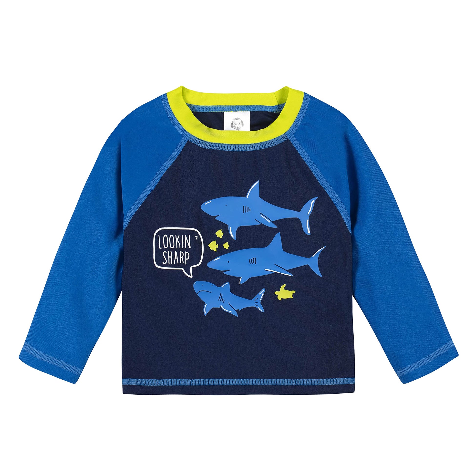 - Q: What design features does this swim set have? A: The set includes a navy/blue rashguard with 'Lookin' Sharp' shark art and light blue/white shark printed swim trunks.