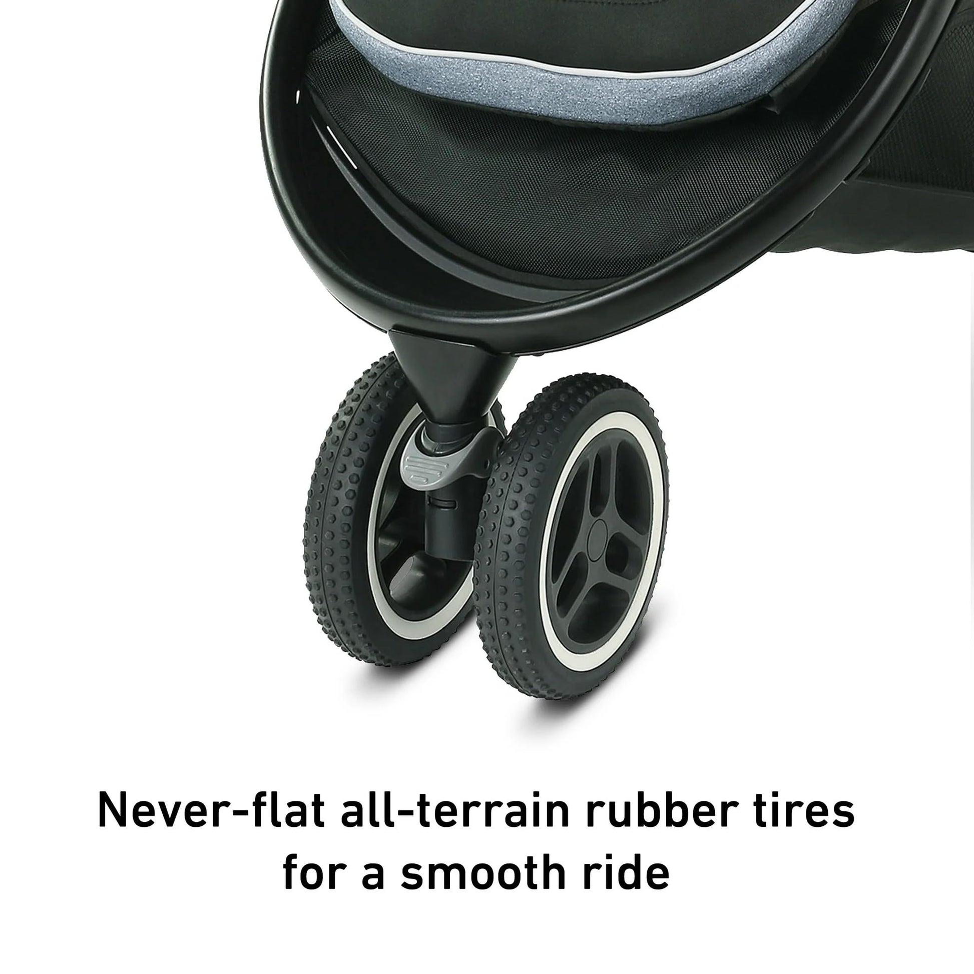 - Q: What type of terrain is the stroller suitable for? A: The stroller is equipped with never-flat, all-terrain tires, providing a smooth ride on various surfaces, making it suitable for both quick outings and longer trips.