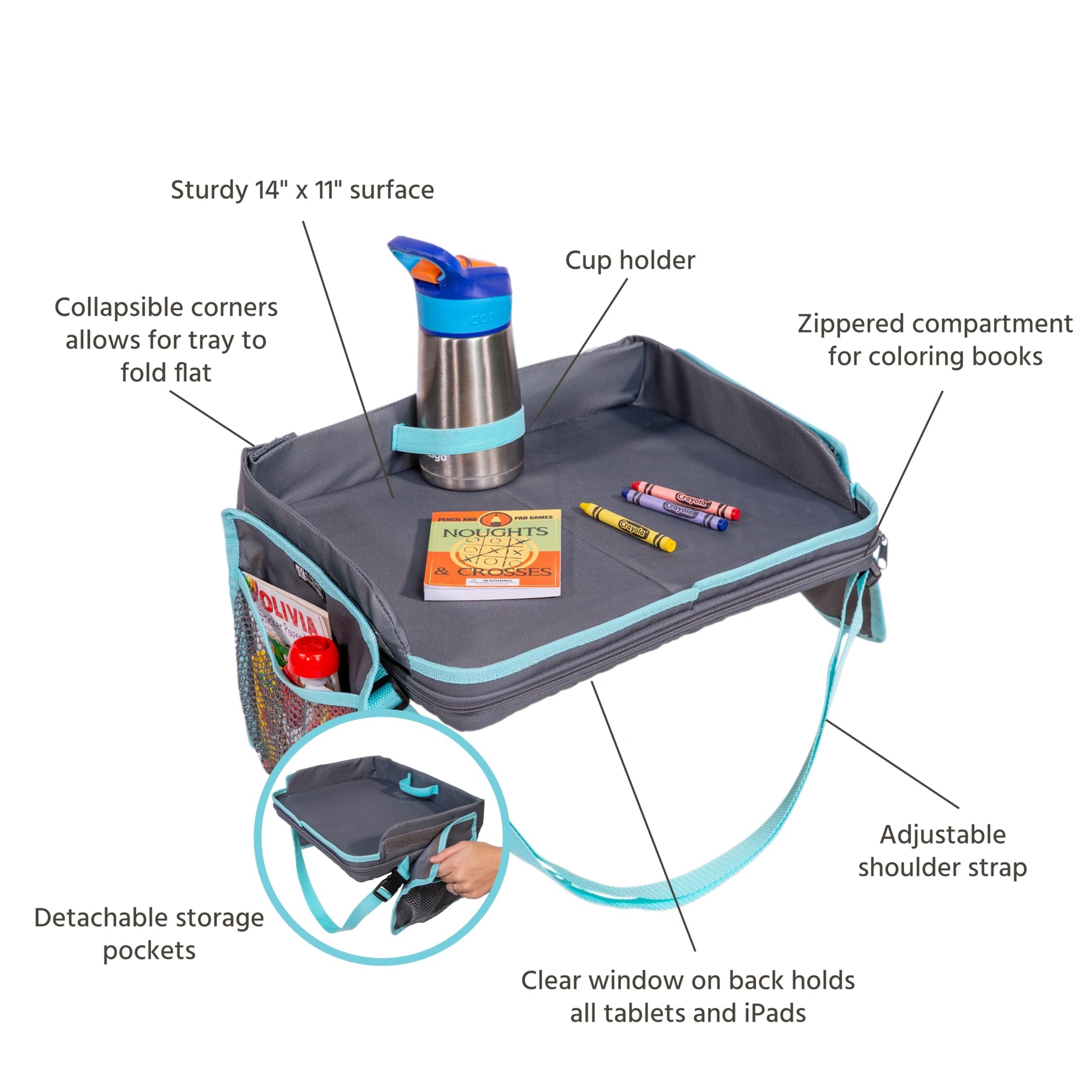 - Q: What types of activities can my child do with this tray? A: The travel tray provides a sturdy surface for schoolwork, coloring, snacks, and games, keeping children entertained during travel.