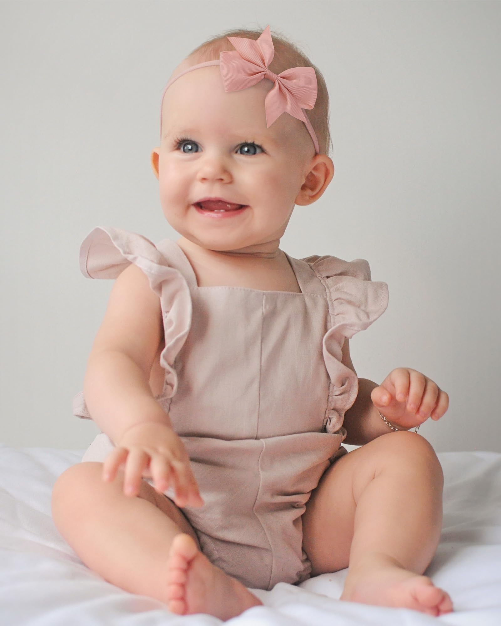 - Q: What is the size of the hair bows and headbands? A: Each hair bow measures approximately 4 inches, and the headband has a girth of about 14.2 inches, allowing it to expand as your baby grows.