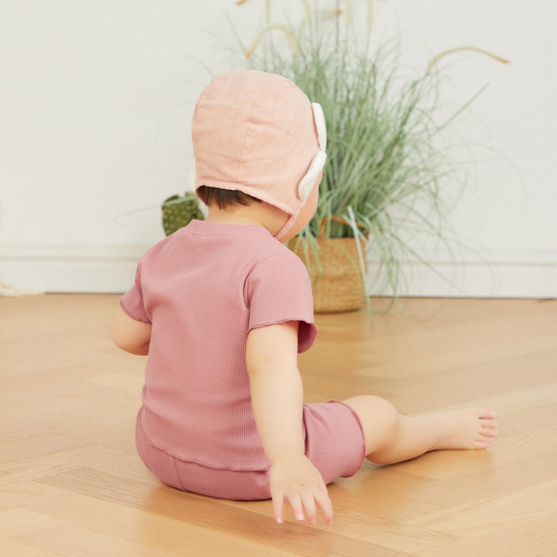 - Q: What design features does this outfit have? A: The outfit features a solid plain color with a ribbed knitted design, short sleeves, and an elastic waistband for the shorts, ensuring ease of wear for toddlers.