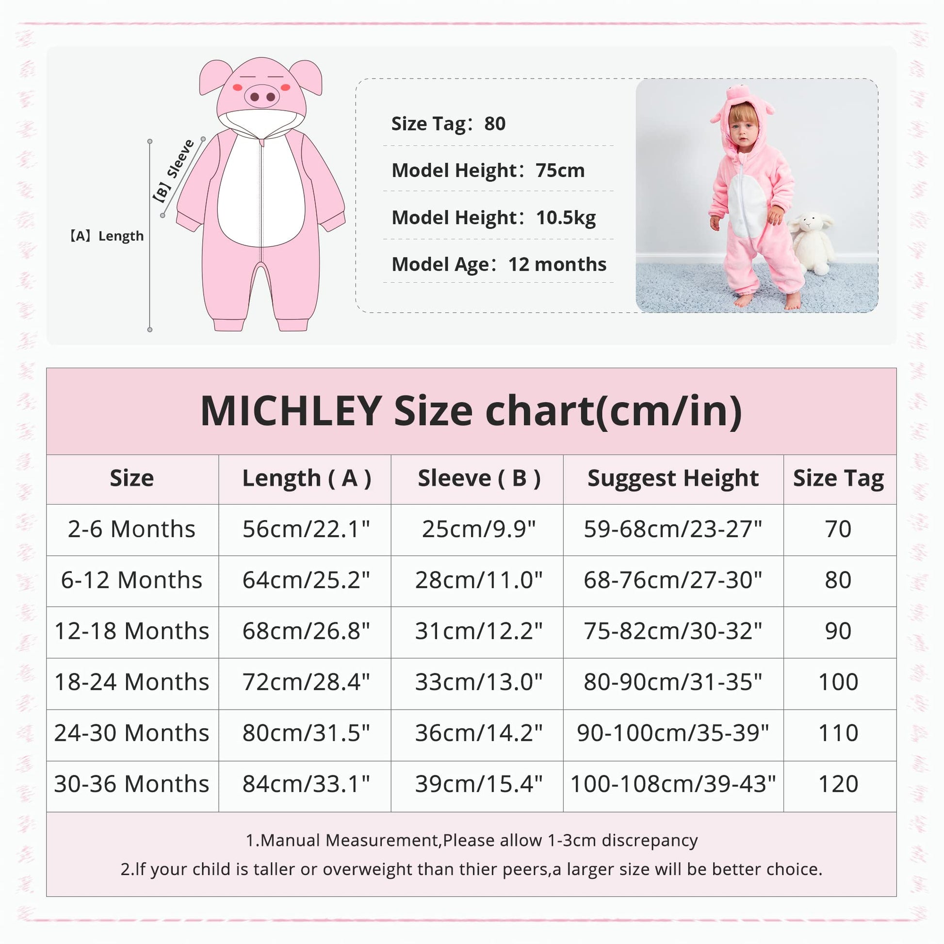 - Q: What sizes are available for the MICHLEY Baby Romper? A: The MICHLEY Baby Romper is available in multiple sizes including 70cm for ages 2-5 months, 80cm for ages 6-12 months, 90cm for ages 13-18 months, and 100cm for ages 19-24 months.