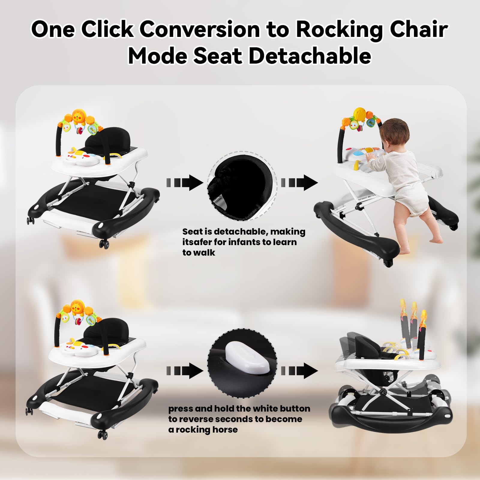 - Q: How many modes does this baby walker have? A: This baby walker features a 5-in-1 design that allows it to be converted into Walk mode, Bouncer mode, Rocking mode, Push mode, and Eating mode.