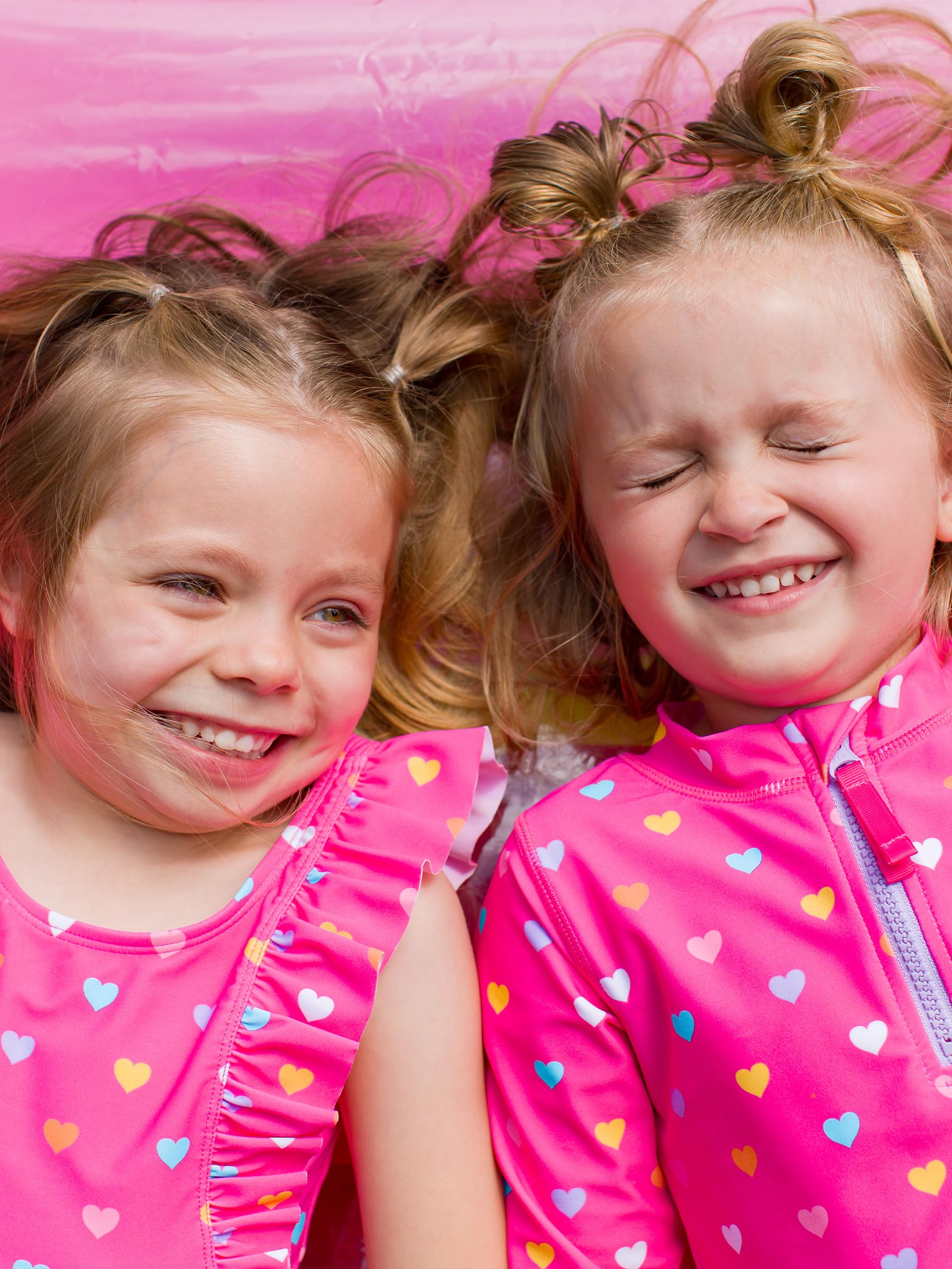 - Q: Are there any other color options available for this swimsuit? A: This specific listing features a colorful hearts design; however, RuffleButts typically offers various designs and colors for their swimsuits.