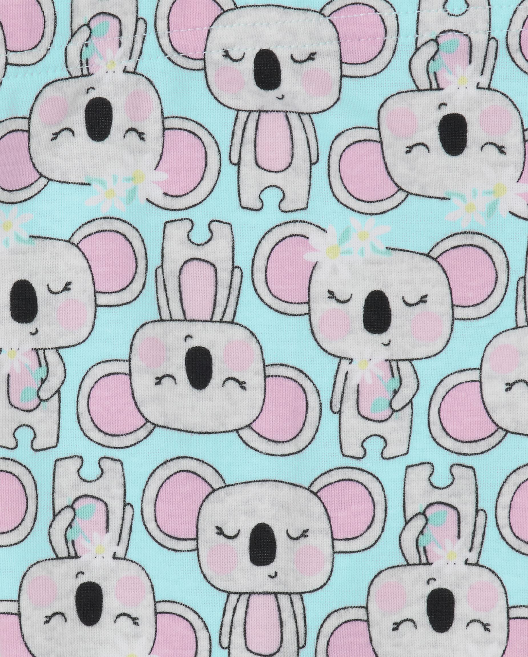 - Q: What designs are featured on the pajamas? A: The set includes two pajama tops: one with a unicorn face graphic design and another with a koala face graphic design. It also features matching pajama pants with allover unicorn and koala prints.