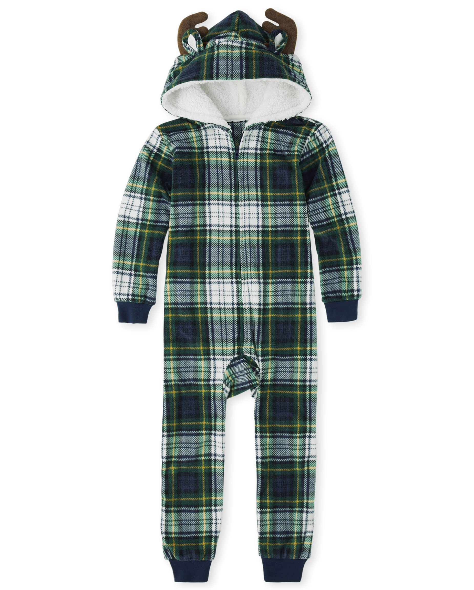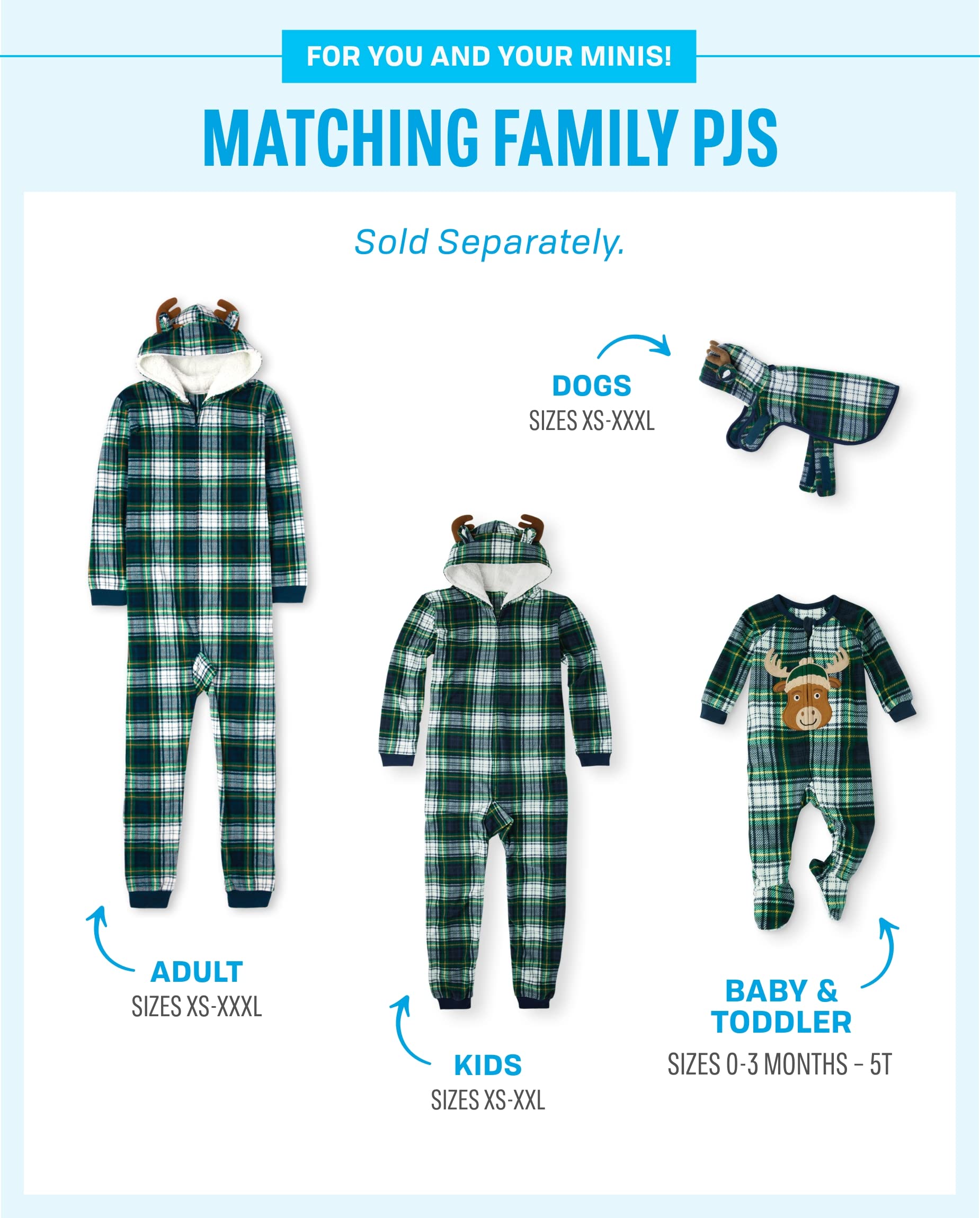 - Q: What design elements are included in these pajamas? A: The pajamas feature rib-knit banded sleeve cuffs and leg cuffs, an attached hood with 3D moose antlers and ears, and an allover plaid pattern.