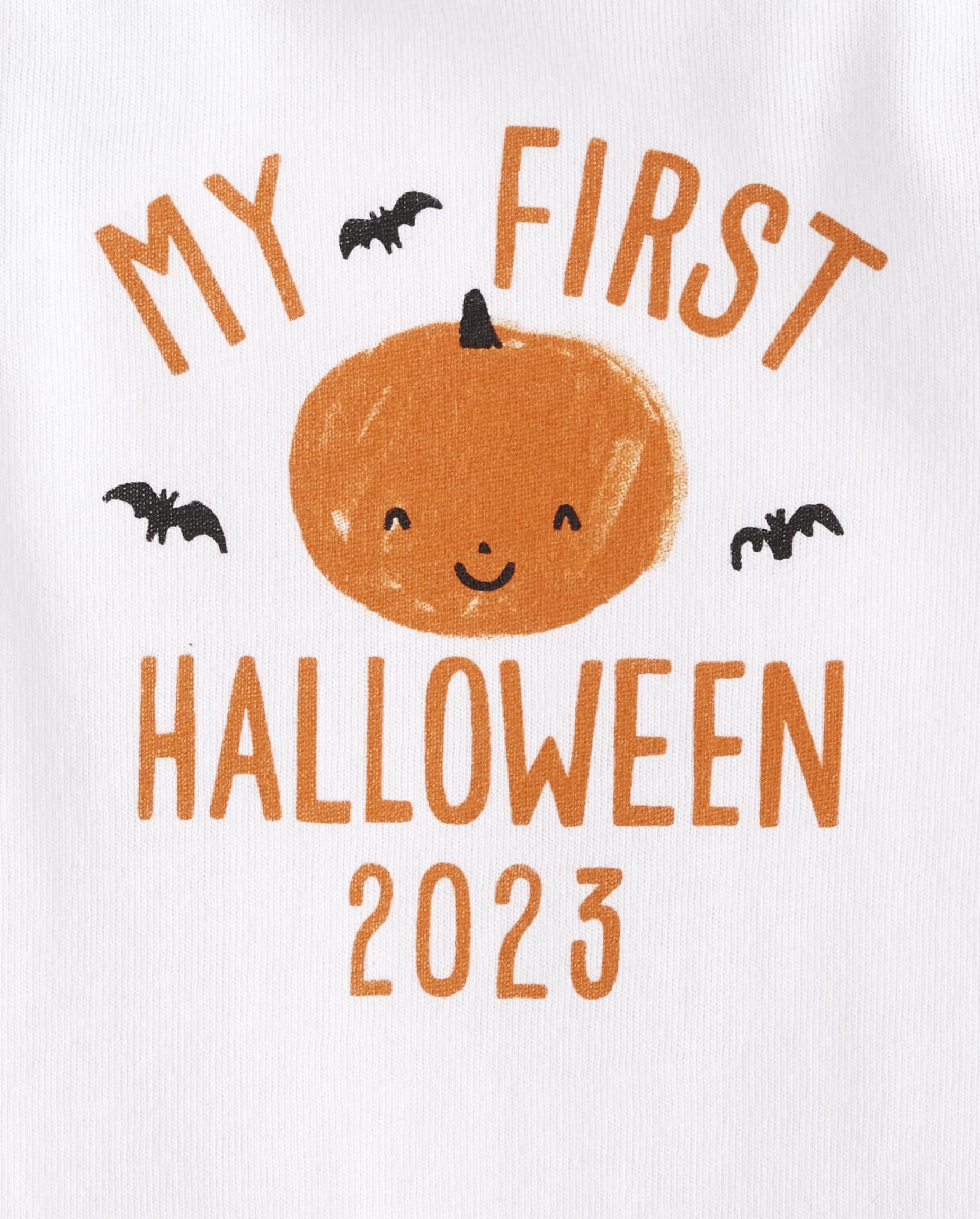 • Q: Does this bodysuit have any special graphics? A: Yes, it features a 'My First Halloween 2023' graphic design at the front, making it perfect for Halloween celebrations.