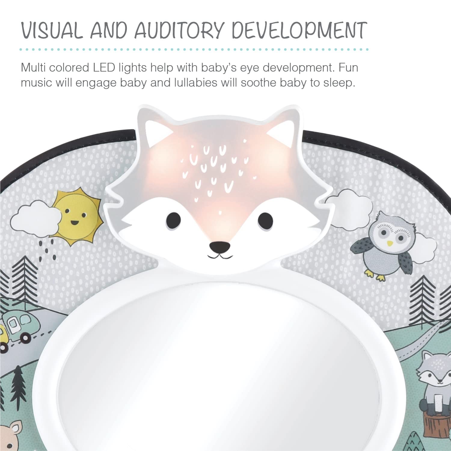 Your little one will dream of playing with the friendly fox in the forest of The Peanutshell Woodland Musical Mirror. An adorably illustrated woodland scene includes forest creatures, a sunny smile, hills and trees. Features include a soft padded frame and shatter resistant clear mirror. There are multicolor LED lights for visual entertainment and 30 plus minutes of lullaby music for baby to fall asleep to. Encourages visual and auditory development. Designed to fit most vehicles.