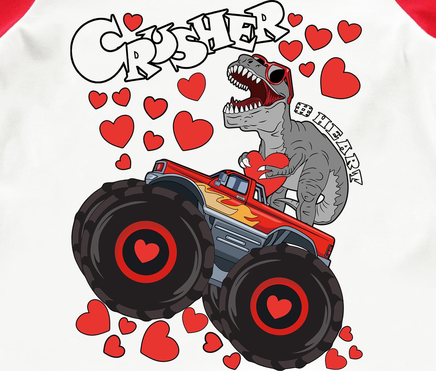 - Q: What unique designs are featured on this shirt? A: The shirt features fun designs including a monster truck, dinosaurs, robots, and hearts, appealing to both boys and girls.