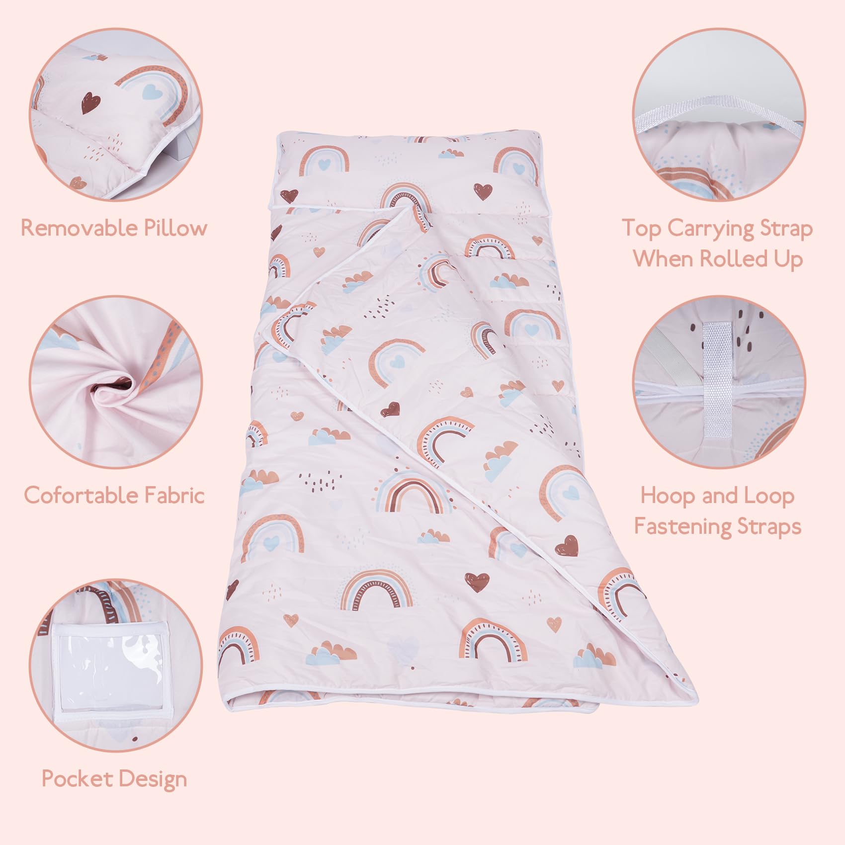 - Q: Can this nap mat be used for travel? A: Yes, the Toddler Nap Mat rolls up easily for travel and includes a carrying handle and Velcro enclosure for quick transport.