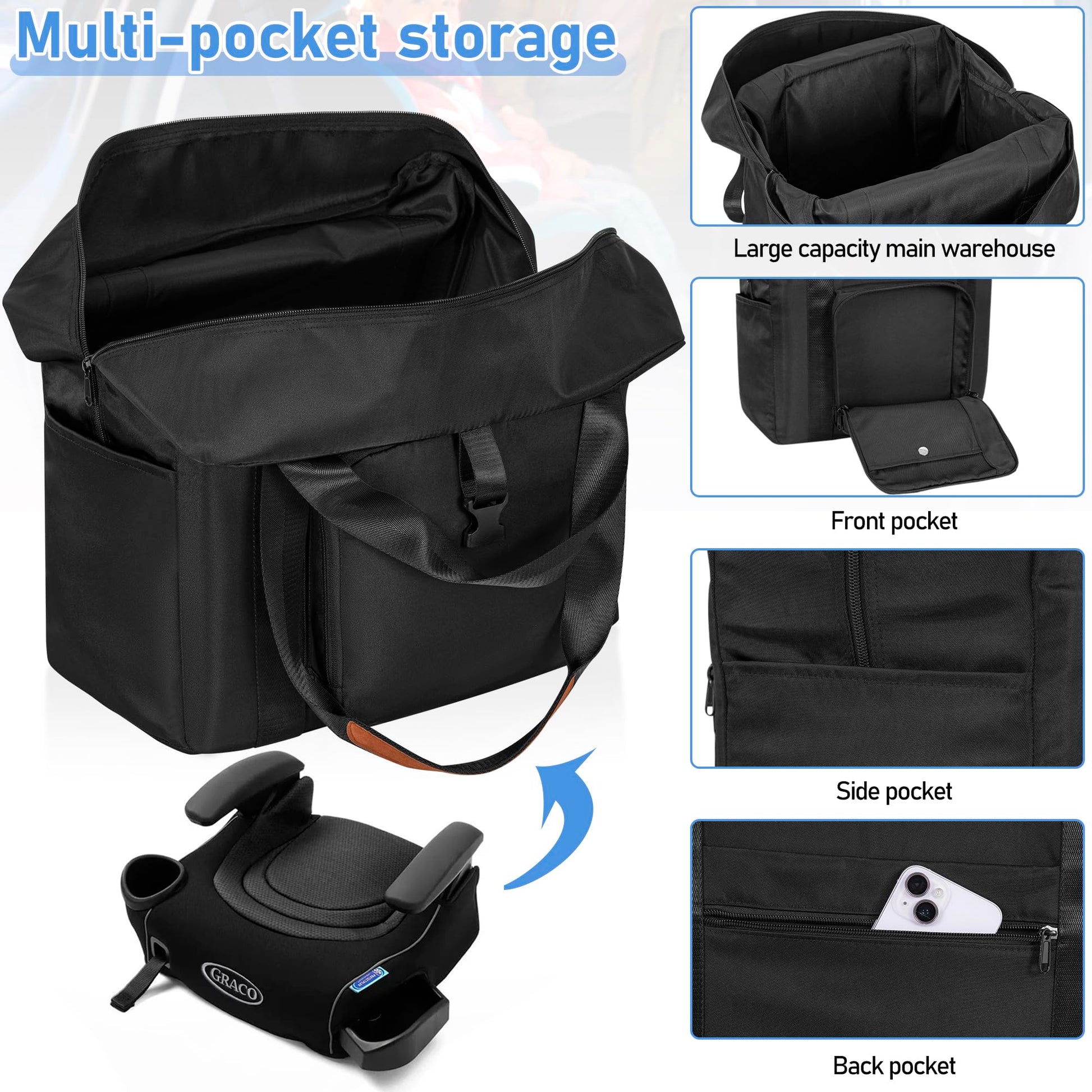 - Q: What should I do if my booster seat doesn’t fit in the bag? A: For best results, please confirm the size of your booster seat before purchase to ensure compatibility with the TORIBIO travel bag.