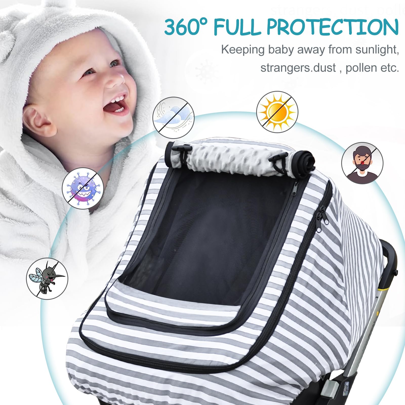 - Q: Is this cover suitable for both boys and girls? A: Yes, the baby car seat cover is designed for both boys and girls, featuring a neutral grey stripe print.