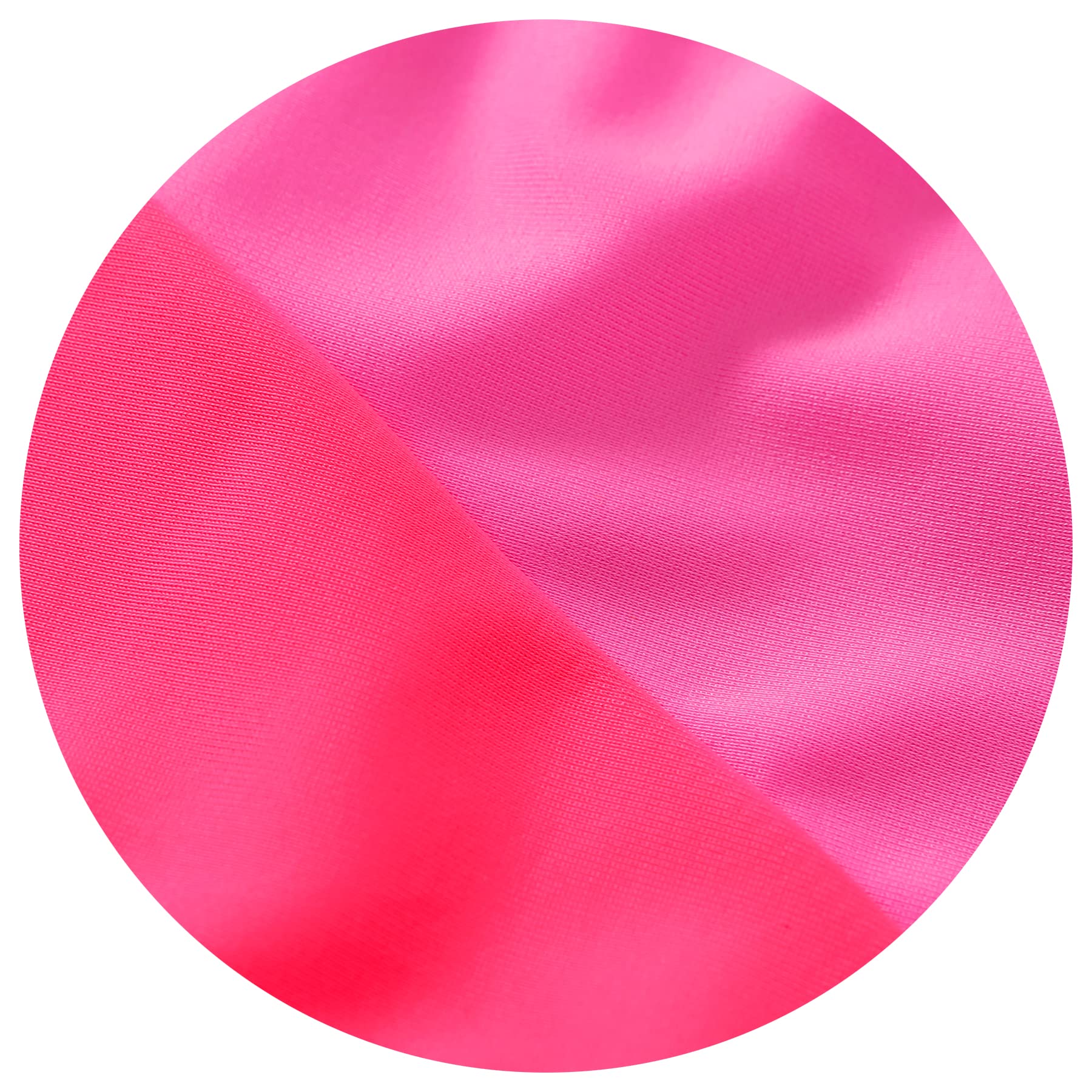 - Q: What colors are included in the swimsuit design? A: The swimsuit features pink and orange stripes, along with yellow and dark pink color blocks.