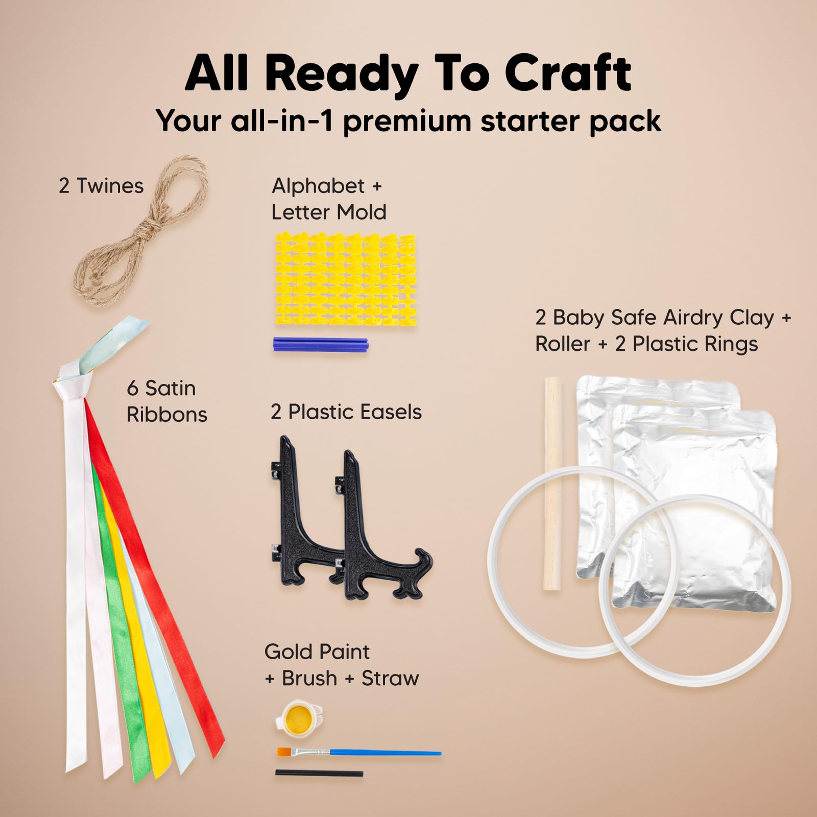 • Q: What is included in the Baby Hand and Footprint Kit? A: The Baby Hand and Footprint Kit includes 2 baby-safe air dry clay packs, 2 shaped rings, acrylic paints, 2 paint brushes, 6 satin ribbons, 2 twig strings, and alphabet stamps.