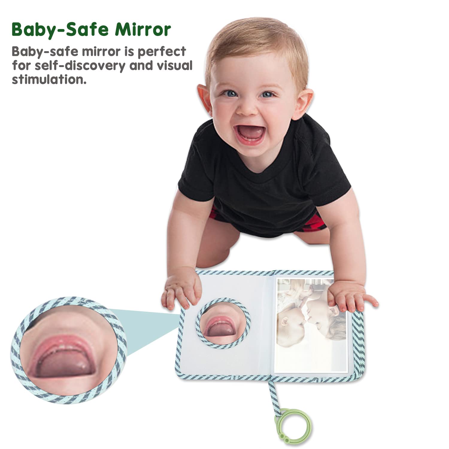 • Q: Does the album include a mirror? A: Yes, there is a small mirror with a diameter of 5 centimeters included in the album to engage your baby and stimulate curiosity.