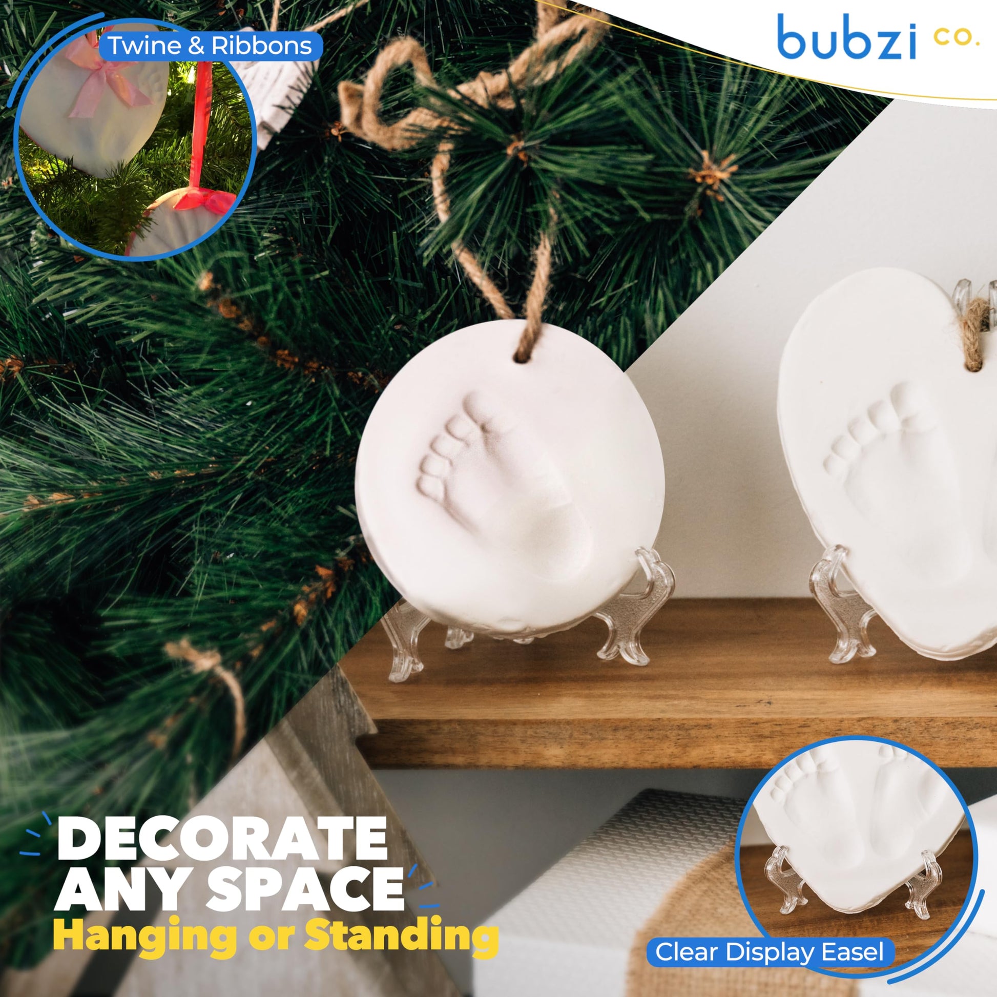 - Q: What age is this baby keepsake ornament kit suitable for? A: The Bubzi Co Baby Keepsake Ornament kit is suitable for newborns and can be used to capture handprints and footprints during the first few months of life.
