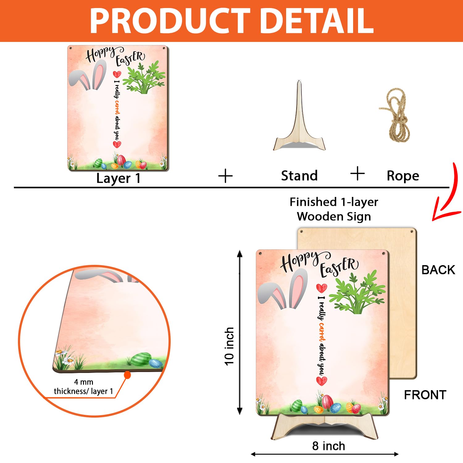 - Q: What sayings are included on the sign? A: The sign features colorful sayings like 'Hoppy Easter, I really carrot about you'.