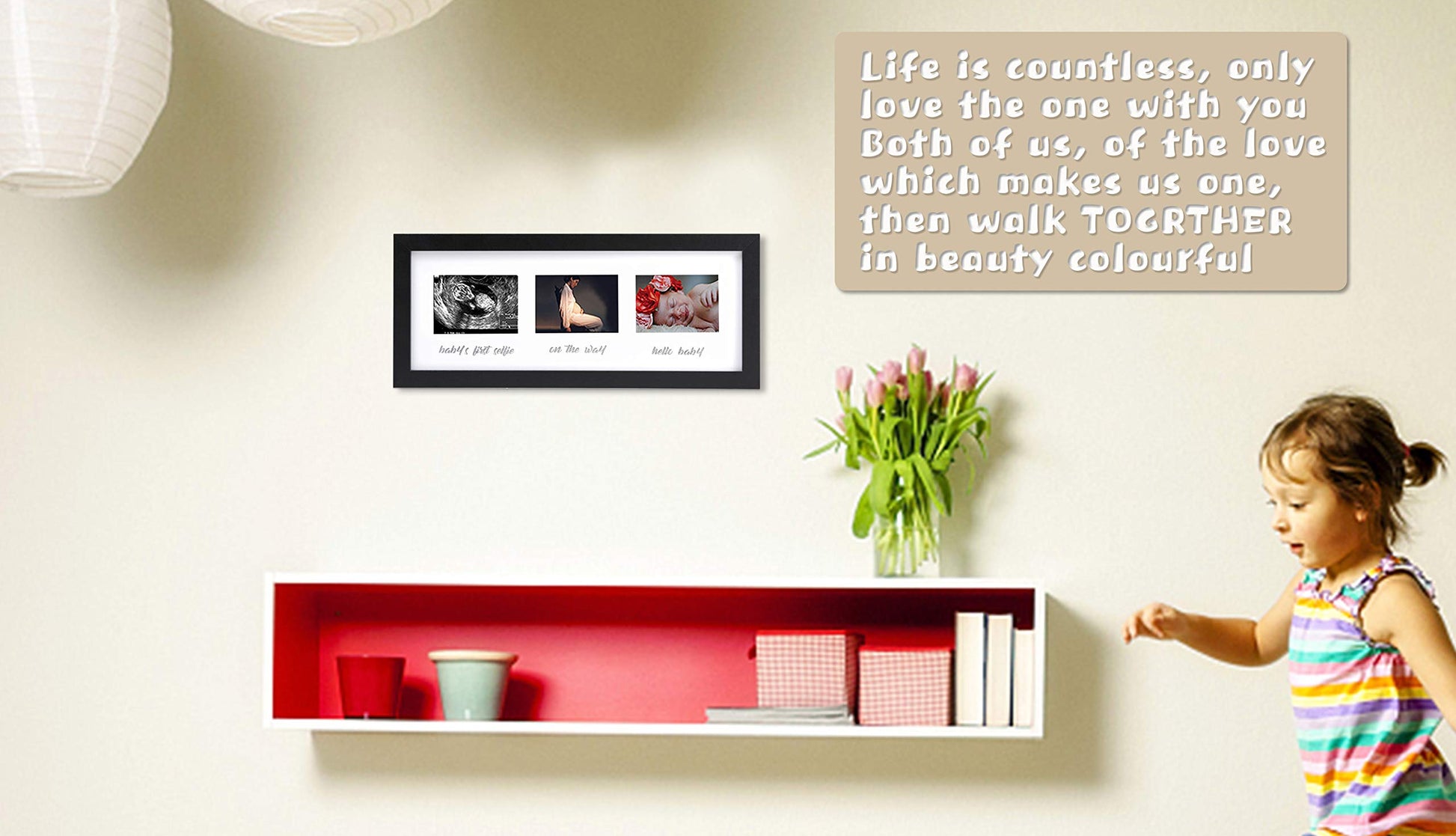 An unique wooden photo frame, White Our triple sonogram pregnancy keepsake picture frame is a fun way to show baby 's sonogram picture, three photo openings match different silvery foil emotional phrase, stamped on the front. Three different options with silvery text are available It is the perfect sentiment to welcome baby into the world and your home to say 'first trimester, second trimester, third trimester ', 'baby 's first selfie, on the way, hello baby ' . and then in a babys voice, say 'my first selfie, mom&me, Im here ' to express baby cant wait. It comes in white, perfect for baby boy or baby girl! The perfect pregnancy gifts for baby, moms&mens, grandparents It 's great for baby showers for any expecting mom or the expecting couple. They will love having this keepsake to cherish their growing baby. It 's the perfect baby shower gift for baby girl or baby boy. Don 't forget to add this adorable keepsake to your registry for your baby girl or baby boy. Pregnancy announcement gifts for grandparents, our baby sonogram picture frame is a great surprise. It 's amazing that they became new grandma and grandpa. A thoughtful gift from the expectant parents or from friends welcoming the new grandparents to the 'club '. A emotions decor, full of art and uniqueness Includes hanger for easy wall mounting and an easel to display on a tabletop. The modern, white frame will add a special touch and artist to your little one 's nursery or room or your home. and will be a good baby nursery decor or baby girls room decor or wall art.